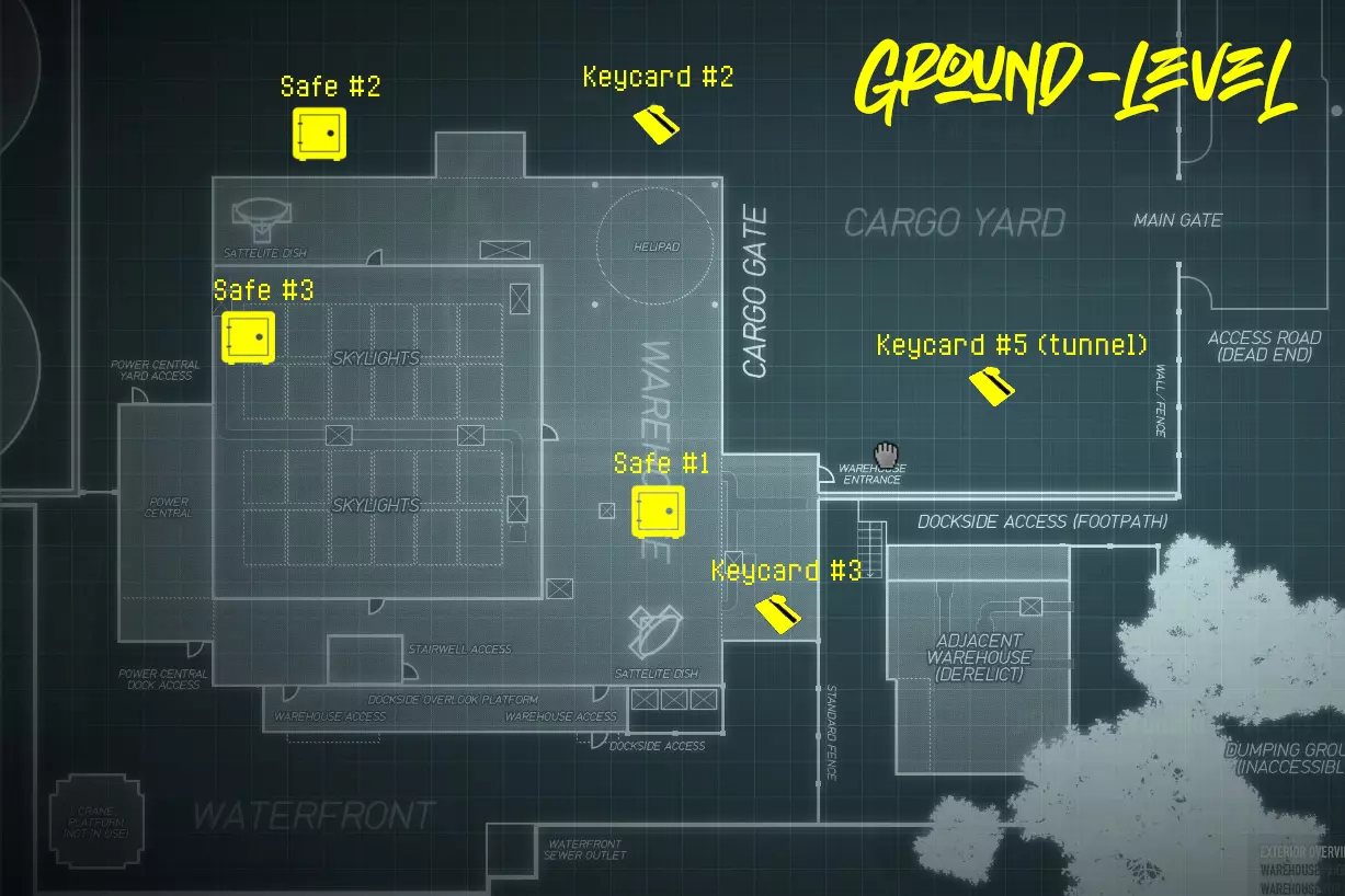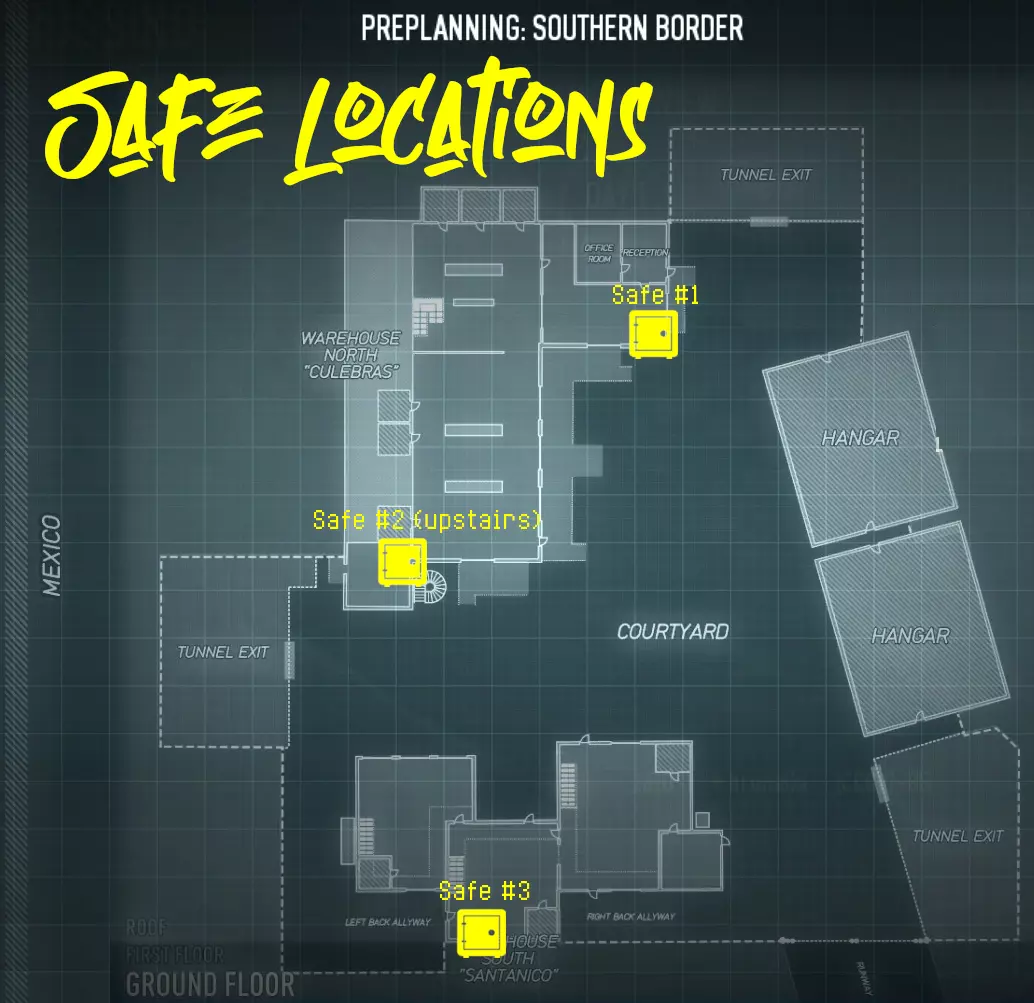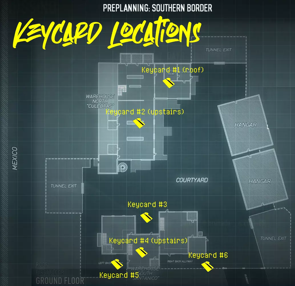 目标: 在墨西哥找到两张特殊钥匙卡以打开失落保险箱,然后窃取一名怀恨在心的暴力囚犯的录音。 地图上共有6个不同的钥匙卡刷新点和3个不同的保险箱刷新点,每次任务都会刷新2张钥匙卡和1个保险箱! 所有刷新点概述:钥匙卡和保险箱均只会在任务的后半段(小队穿过隧道抵达墨西哥后)刷新。任务前半段(超杀摩托车俱乐部会所)没有任何刷新点。 要到达钥匙卡#1的刷新点,你需要购买能让你进入北仓库屋顶的资产! 钥匙卡位置: