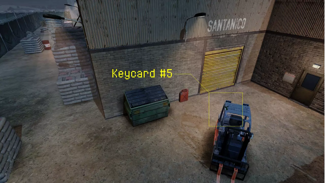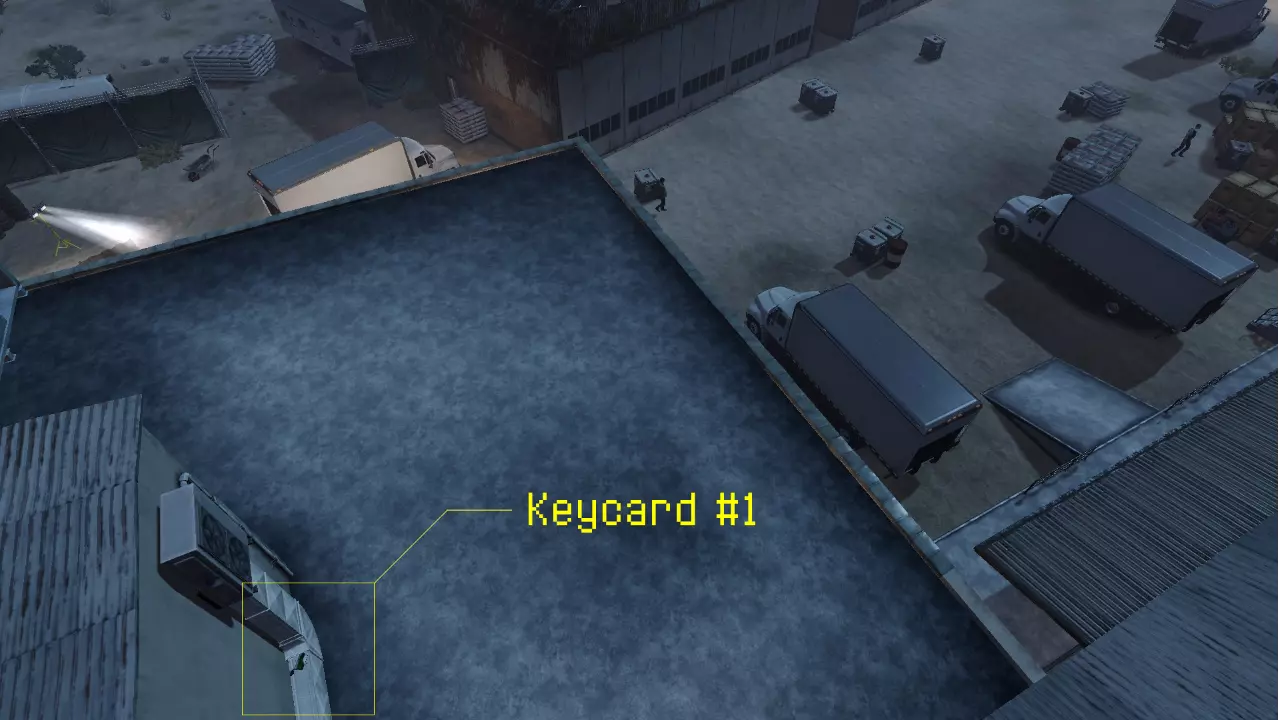 在仓库外的院子里,两个集装箱的顶部(上面的集装箱是蓝色的),位于仓库入口的右侧,从直升机停机坪向下看时可见 ㅤ 钥匙卡 #3: