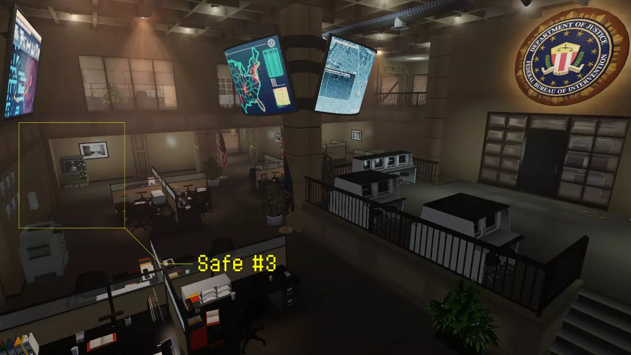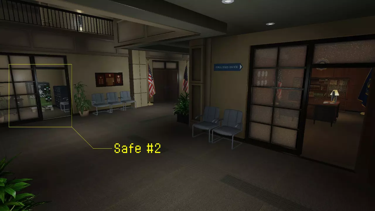 第二个保险箱可在一楼找到,位于一间带玻璃窗且门开着的小办公室内,就在联邦调查局局长办公室旁边。 保险箱 #3: