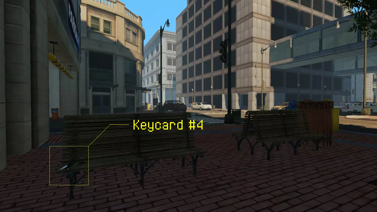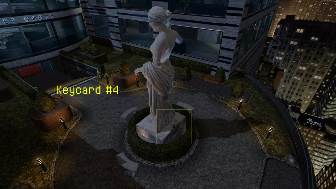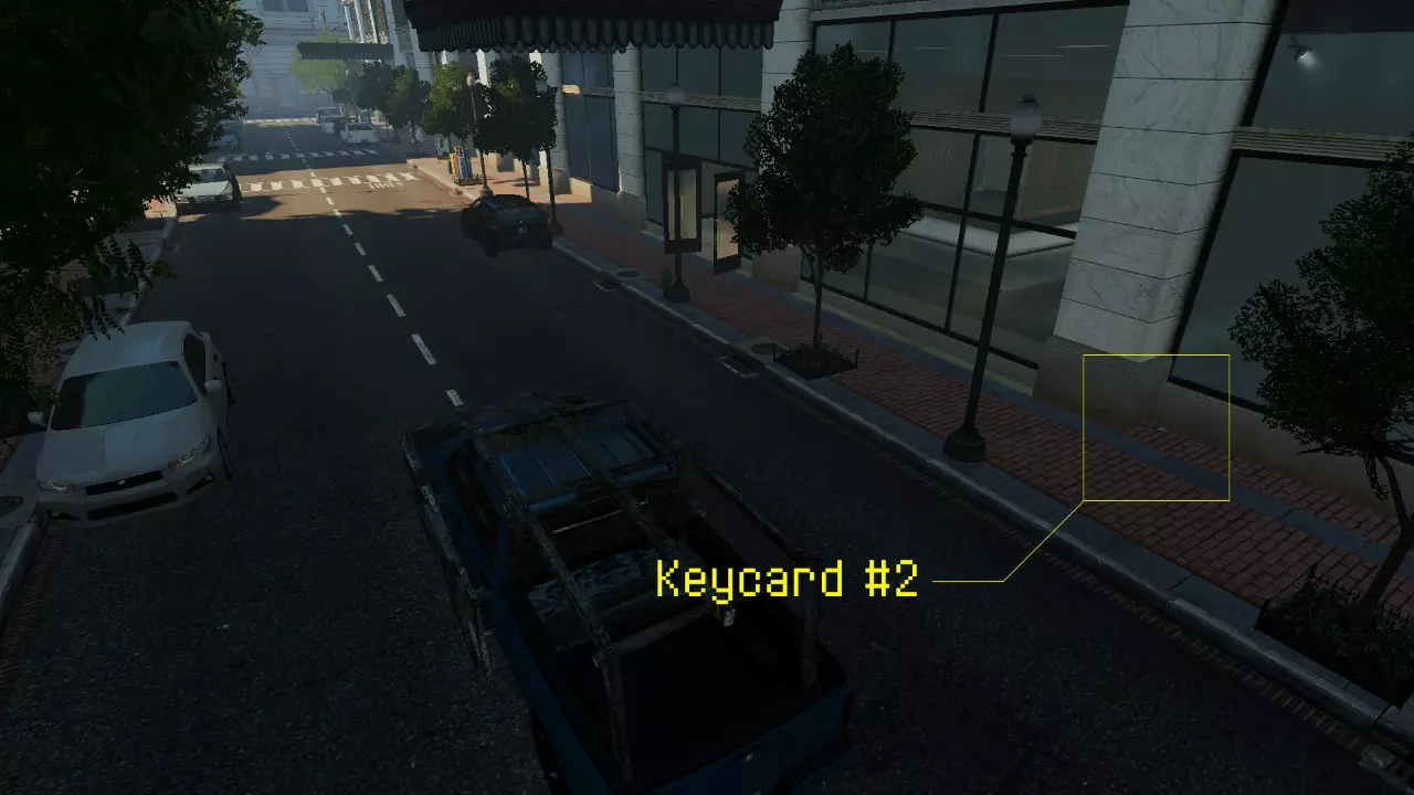 接下来走上楼梯,一旦到达霍斯顿等待的汽车所在的街道层,向左转,第二张钥匙卡就在你刚出来的那栋建筑的其中一根石柱后面。 钥匙卡 #3: