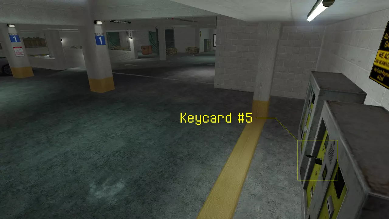 最后一张门禁卡与5号门禁卡位于同一楼层。它藏在车库内施工区域的一个非常大的施工集装箱下面。你可以在霍克斯顿的车将要驶下的斜坡左侧找到它。门禁卡就在柱子旁边的集装箱下面。 遗失的保险箱刷新点:保险箱#1: