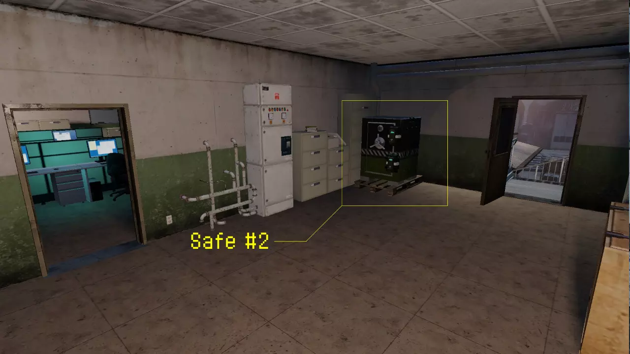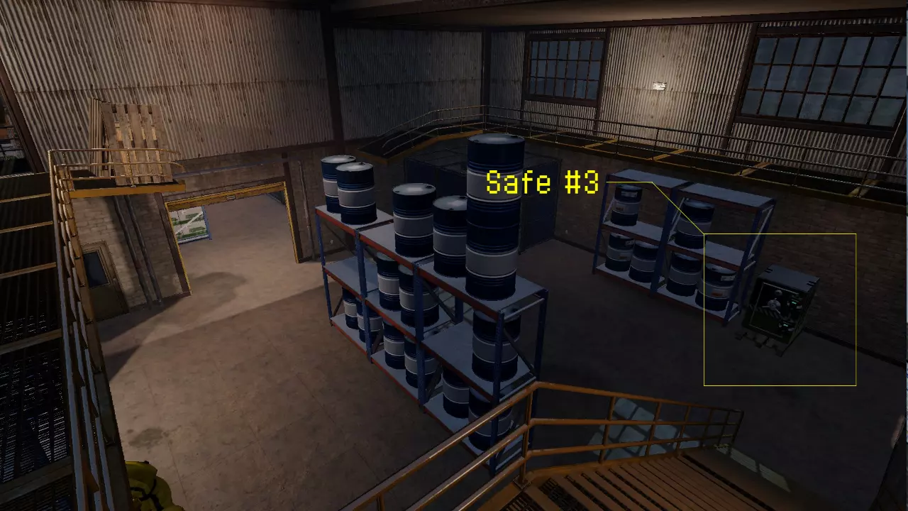 第二个保险箱同样可以在北部仓库找到。上到一楼,进入最南侧的房间。该房间位于有所有电脑和办公桌的房间旁边,并且有一个通往室外的螺旋楼梯。 保险箱 #3:
