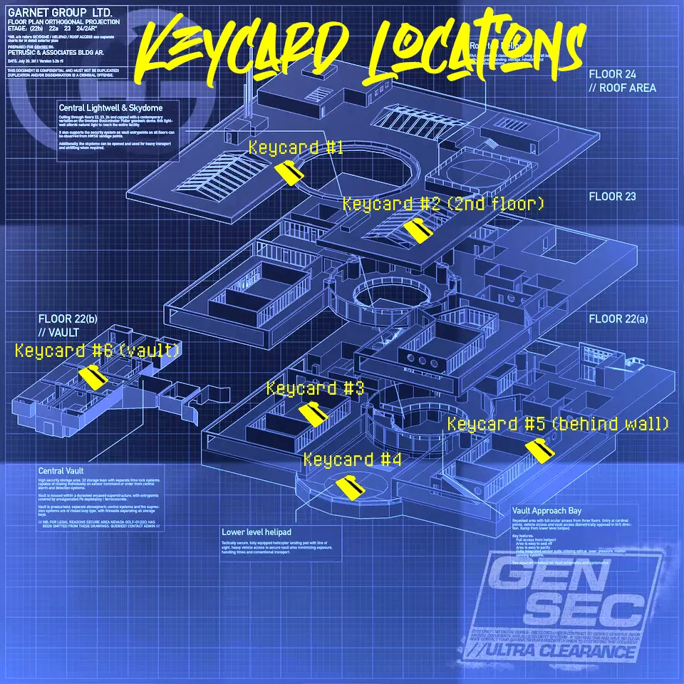 目标: 找到2张特殊钥匙卡以打开失落保险箱,然后窃取一份GenSec股东的血腥录音。 地图上共有6个不同的钥匙卡刷新点和3个不同的保险箱刷新点,每次必定会刷新2张钥匙卡和1个保险箱! 所有刷新点概览:一层地面