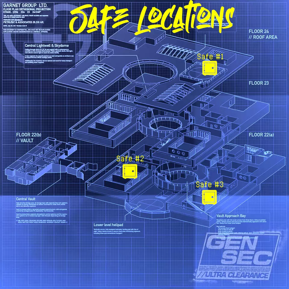 目标: 在第一天找到两张特殊钥匙卡,以便在第二天打开失落保险箱,然后窃取一名特工预测阴谋的录音。 警告: 钥匙卡在地图的圣诞版本中似乎不会生成。 - 感谢DepravedPiedCrow 地图上共有6个不同的钥匙卡生成点和3个不同的保险箱生成点,每次都会生成2张钥匙卡和1个保险箱! 所有生成点概览: 遗憾的是,“霍斯顿越狱”劫案没有可用的预先规划,而且我在网上找不到任何合适的图片。此外,从地图边界外或高空拍摄的截图看起来效果不佳(尤其是第二天的),因此我无法在此提供所有生成点的概览。如果你有任何想法或截图,告诉我,我会更新指南并将你的名字添加到致谢部分!所有钥匙卡都会在第1天生成,所有保险箱都会在第2天生成! 特殊钥匙卡生成位置:钥匙卡#1: