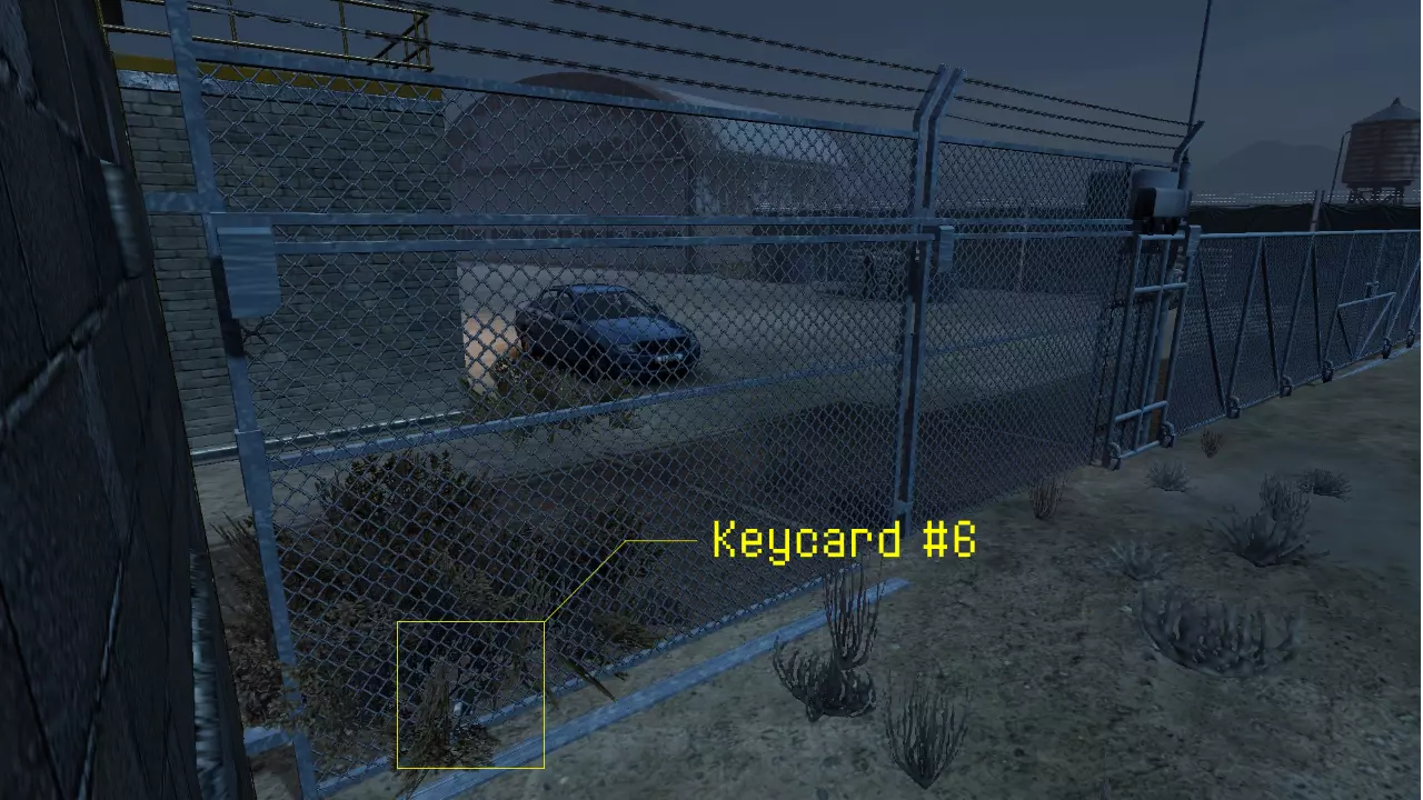 最后一张门禁卡位于你若想乘飞机逃离就需要打开的大门旁边。直视大门,然后稍微向右走——地上会有一丛灌木,里面藏着门禁卡。 遗失的保险箱刷新点:保险箱 #1: