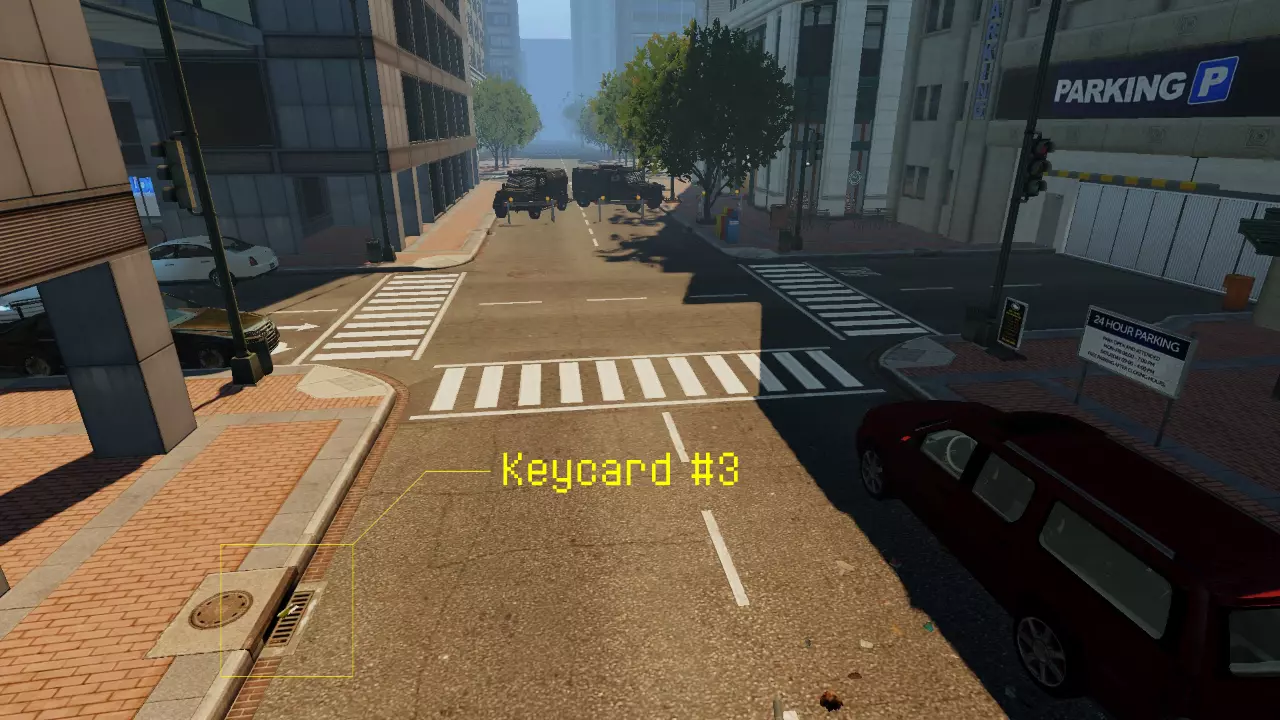 下一张钥匙卡位于该关卡街道区域尽头的大型停车场附近。你可以在停车场入口附近十字路口旁的其中一个井盖顶部找到它。 钥匙卡 #4: