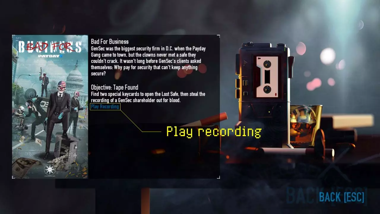在保险库内,你会找到一盘可以拾取的录音带——这是失落录音带之一!一旦拿到它,你无需完成抢劫任务即可离开,因为可播放的音频已经解锁。 聆听背景故事: