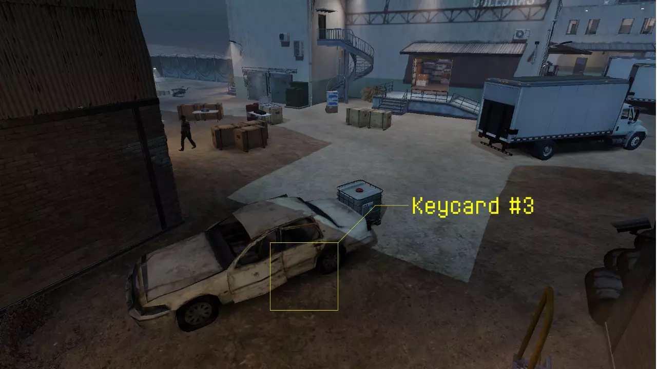 在北部仓库的一楼。进入堆满箱子的仓库区域,在北侧的箱子堆顶部搜索。钥匙卡就在纸板箱上。 钥匙卡 #3: