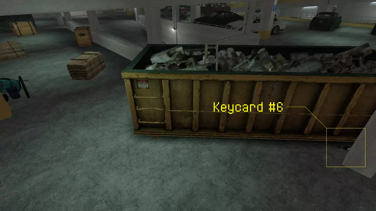 5号钥匙卡有点棘手。它只有一半露在外面,卡在大型停车场内的停车缴费机里。如果你站在停车场内,看向霍克斯顿的车在你清除路障后会驶下的斜坡,缴费机就在你身后的左侧。 6号钥匙卡:
