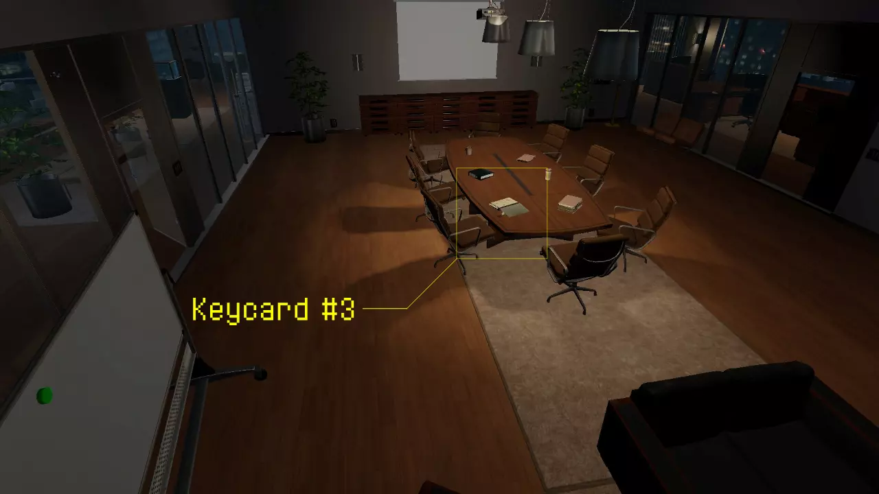 3号钥匙卡在一楼的会议室里(从大雕像处看,位于中央喷泉区域的左侧)。你可以在桌子上找到它,被一些文件半掩着。 4号钥匙卡: