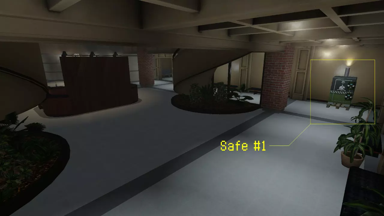 第一个保险箱生成点位于联邦调查局(FBI)大楼一层入口区域的接待处附近。前往左侧的螺旋楼梯,保险箱就在楼梯后方靠近墙壁的位置。 保险箱 #2: