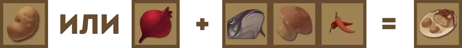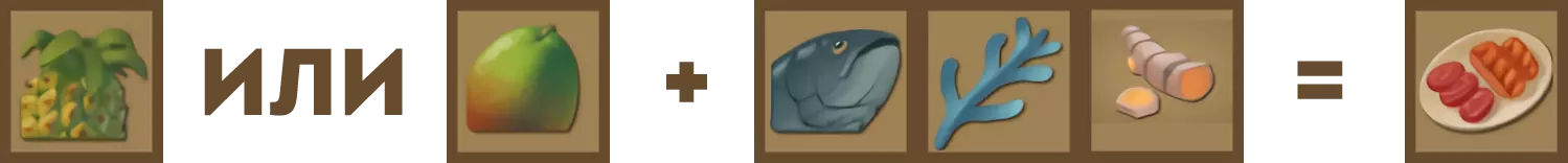 土豆 [x1] 或甜菜 [x1]、鲦鱼 [x1]、蘑菇 [x1]、红辣椒 [x1]。食谱“三文鱼沙拉”:降低水下氧气消耗速度。