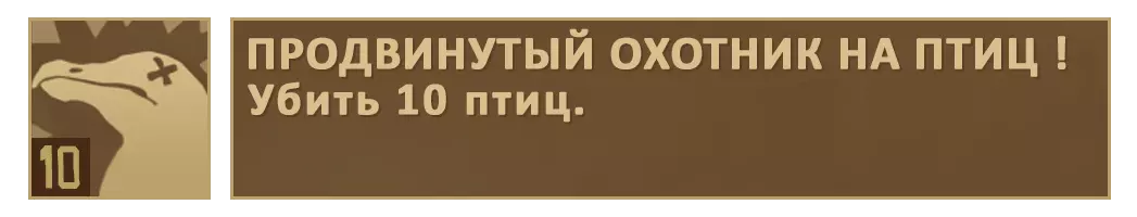 需要用任意武器在任意条件下击杀海鸥。 获取该成就的难点在于平台上可能只有两只海鸥在飞,这意味着你在击杀前一只后需要等待新海鸥出现。有几种获取海鸥的方法: 放置2个鸟巢。 当海鸥落在鸟巢上时,直接用弓箭或近战武器击杀它们。 在田地上种植植物。可以在幼苗附近放置稻草人进行保护。当你听到海鸥的叫声,或者看到它啄食你的幼苗或稻草人时,就把它赶走,然后等待下一次袭击。同一时间只会有一只海鸥试图破坏你的菜园,所以通过这种方式获取成就比第一种方法需要更多时间。 用弓箭射下飞行中的海鸥。 这是获取海鸥最困难的方法。
