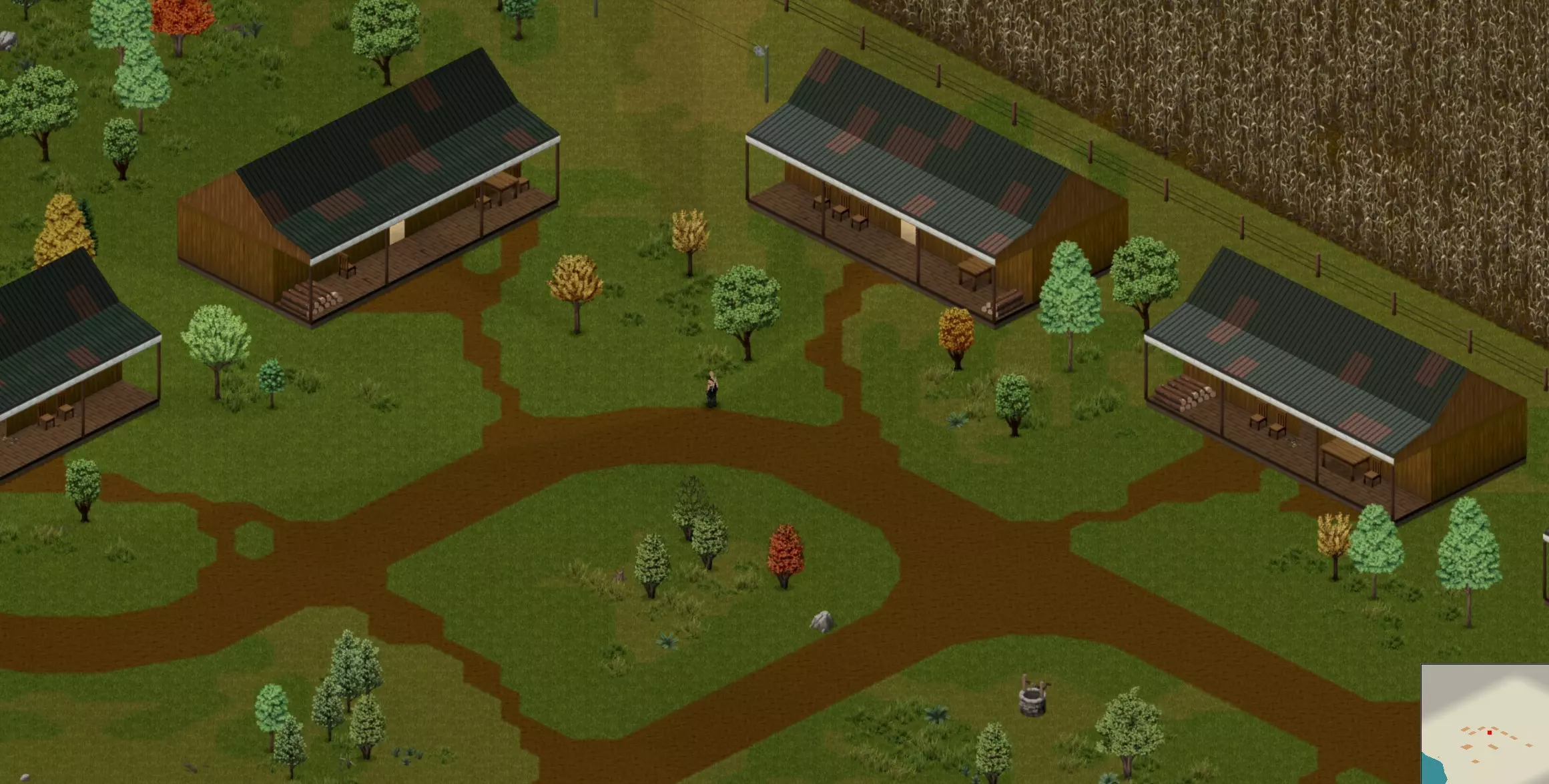优点 + - 有围栏和大门,但无法抵御僵尸 - 附近有湖泊和河流,大部分区域被河流和湖泊环绕 - 其中一间房屋有发电机刷新的可能性 - 可以找到武器或弹药(但数量较少) - 有大量原木和木材资源 - 区域适合农耕 - 有工作台及所有启动所需物品 - 区域适合饲养动物 - 尸潮迁徙的可能性较低