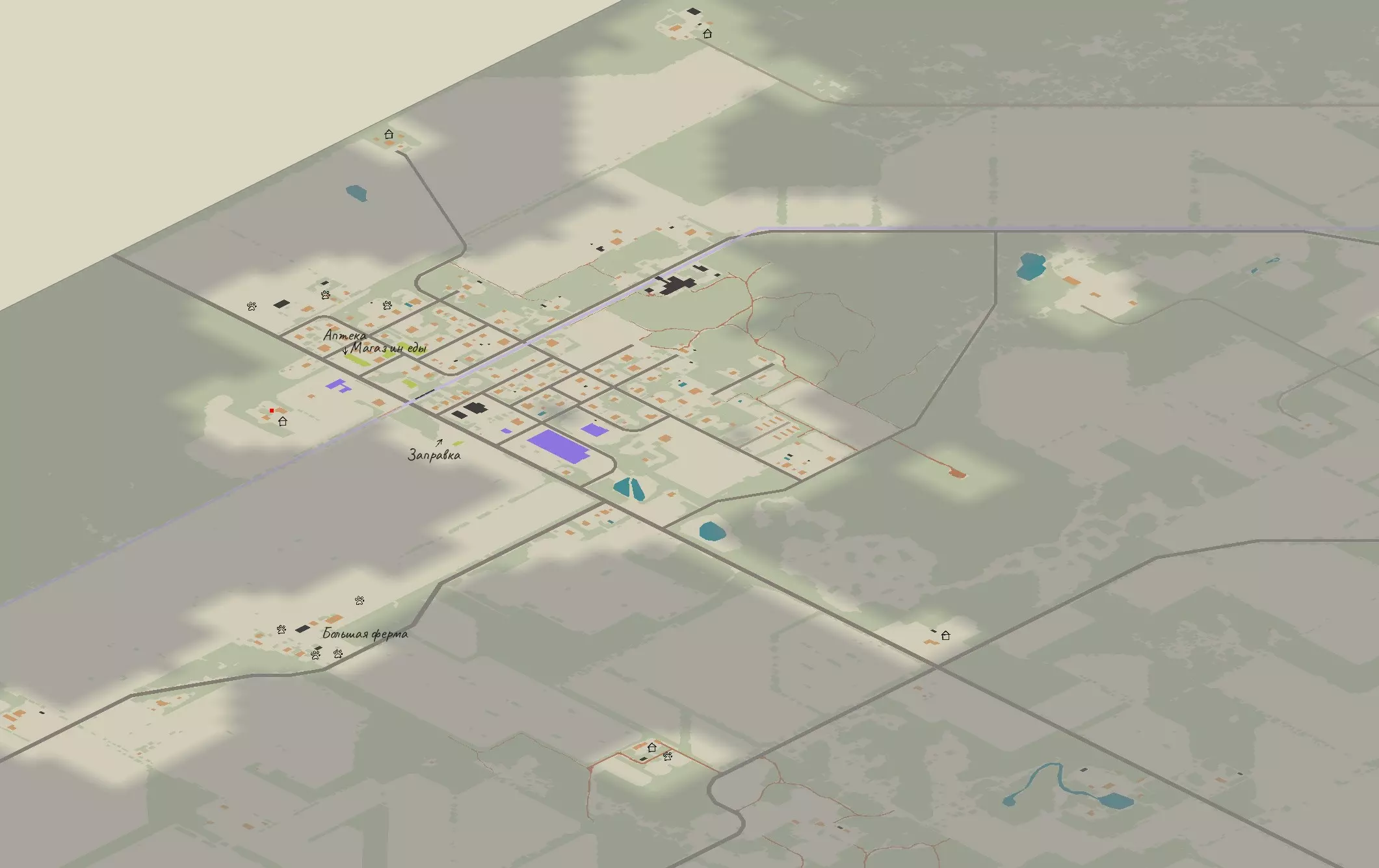 优点 + - 房子相对较大。理想情况下,我会拆掉一些墙壁并进行小范围的重新布置——这里有地下室——有一个小的鸡舍(但没有鸡)——或许可以安装一台发电机——有一个饲养动物的农场——有一口井——左边被湖泊环绕——有一个大型围栏,围起了大部分区域——这是一个相对安静的地方——有一个车库——有一个温室——几乎总能刷出一辆能开的车——配备了用于制作复杂配方的设备。缺点——位置比较偏远。来自城市,没有车根本不行——加油站很远——需要预先清理这片区域——没见过部落,但有1-3个飞行的家伙来过——最好把栅栏和大门弄好 最近的兴趣点