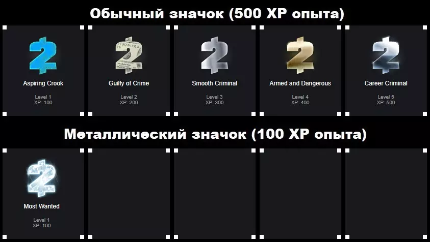以下为您呈现《收获日2》的徽章等级表及其视觉组成部分。 《收获日2》徽章等级 为您展示1级至5级的徽章。 每个升级的徽章将为Steam等级提供100经验值(总共可获得500经验值)。 *额外提供金属徽章外观。 徽章外观如下: