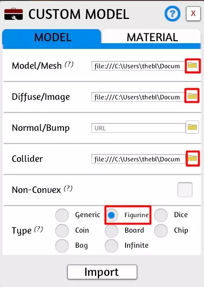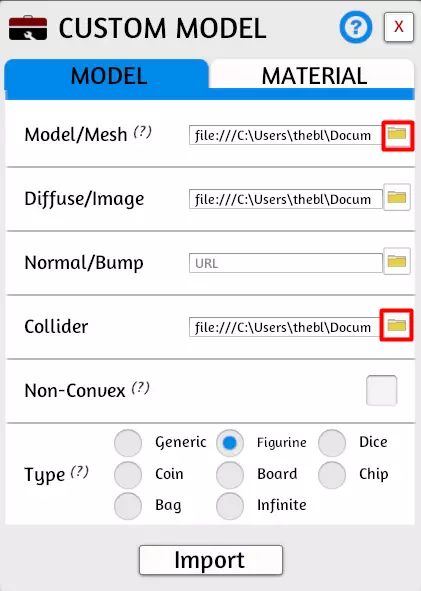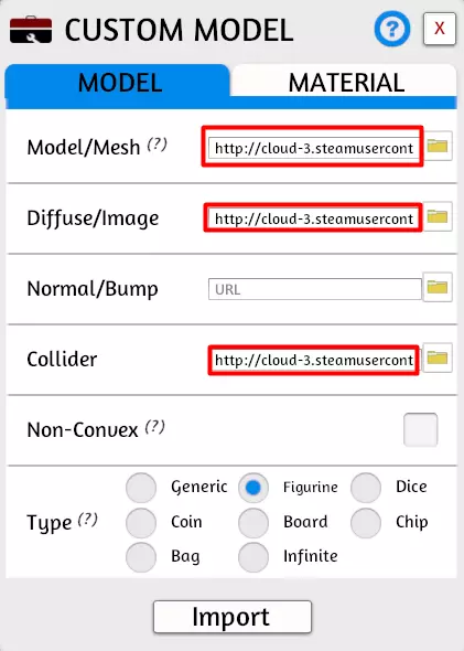 使用每个项目旁边的文件夹图标浏览至相应文件。目前,只需选择一个姿势进行导入。 模型/网格是我们在步骤6中导出的主要网格。 漫反射/图像是我们在步骤1中创建的纹理文件。 法线/凹凸应留空。 碰撞体是我们在步骤9中创建的碰撞层。 你可能会收到建议上传至云端的提示。如果你计划将这些文件上传至非Steam云的其他服务,现在就应上传这些文件,并使用这些文件的URL。 但如果你想使用Steam云,建议现在只需点击“本地”。