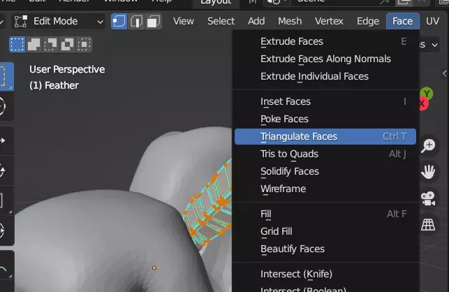 有时这些模型可能会有些问题,因此最好确保已正确进行三角化处理。切换到编辑模式,然后点击“面”->“三角化面”。