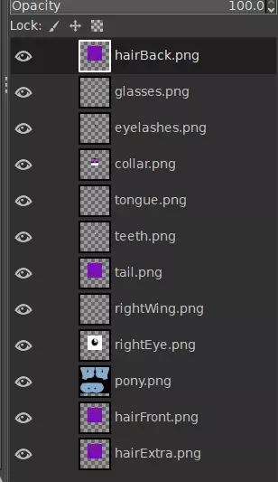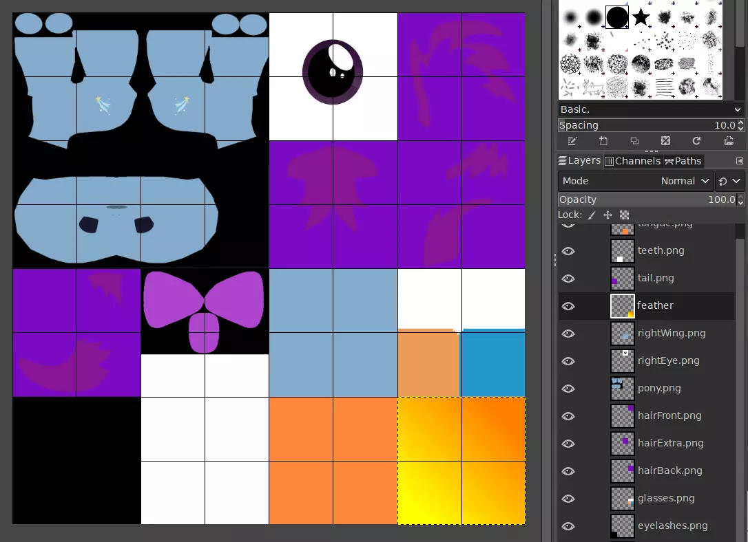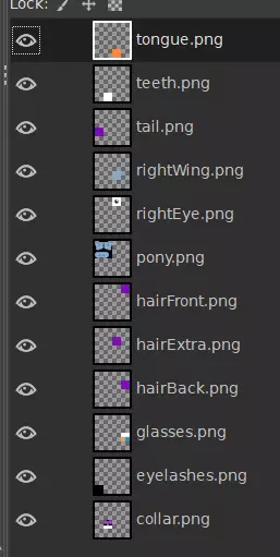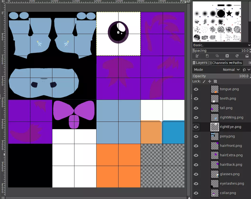 如果需要,请继续放大。你可能会忍不住想放弃使用Ctrl键,直接移动而不进行吸附。对于少数情况来说这或许没问题,但如果你要对齐眼睛纹理等特定内容,这可能会导致错位,所以除非你确实有必要,否则我不建议这么做。 对所有纹理组件重复此操作。 你很可能会忘记哪个纹理组件对应哪个网格。记住,你仍然可以打开我们在GIMP中制作的xcf文件,该文件的所有图层仍会以其原始文件命名。