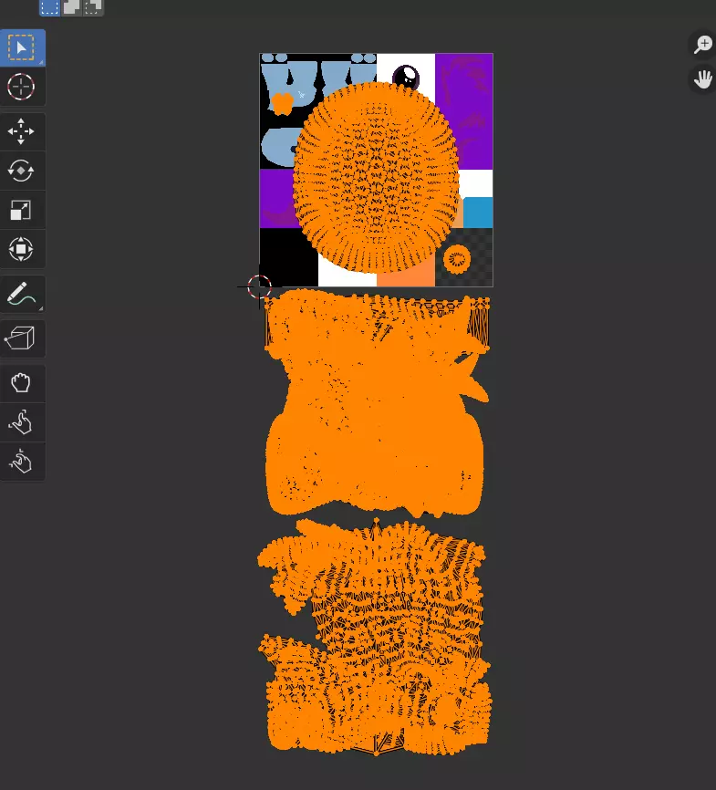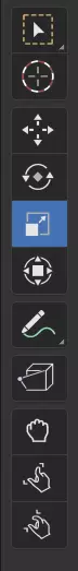 这些是那些网格物体的UV贴图。我们需要调整它们的大小以适配新的纹理文件。在最左侧,点击缩放工具。