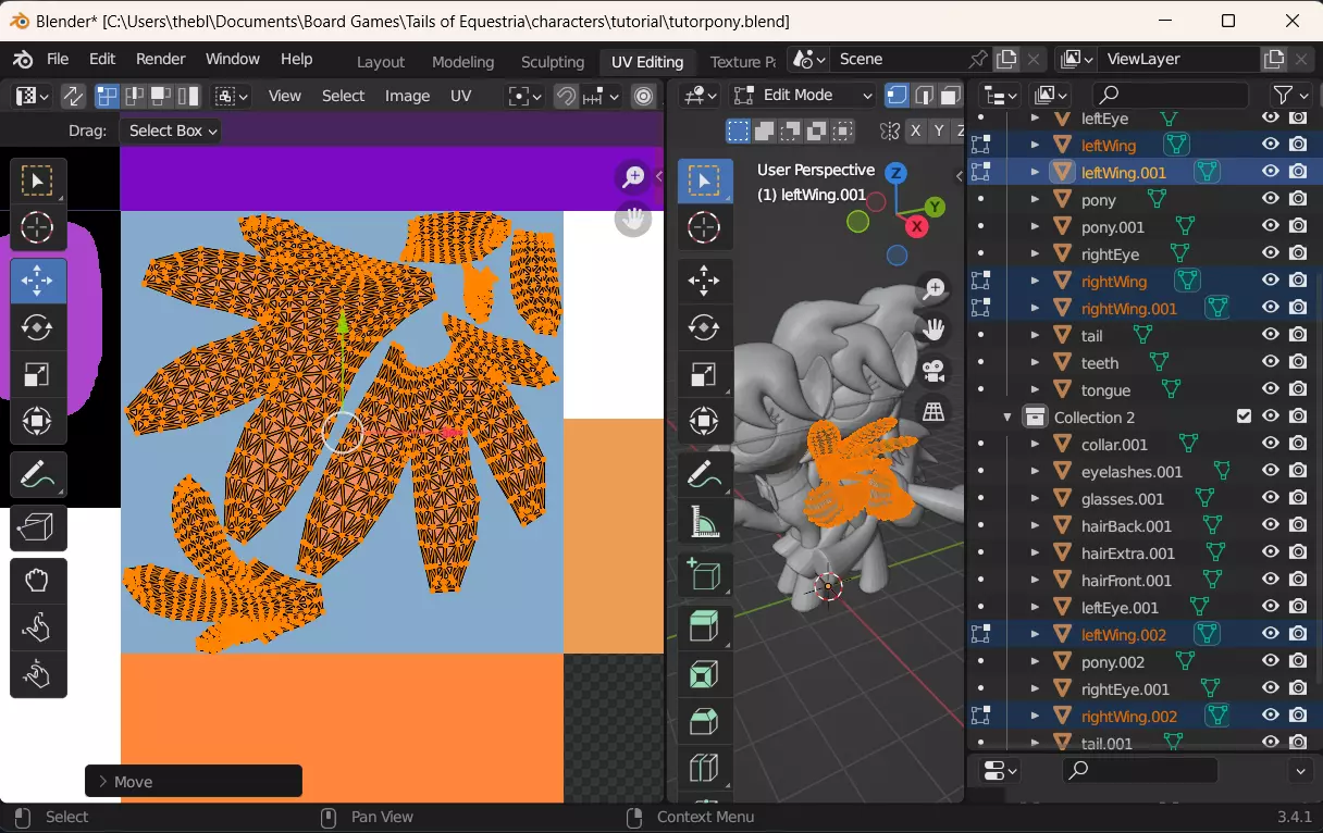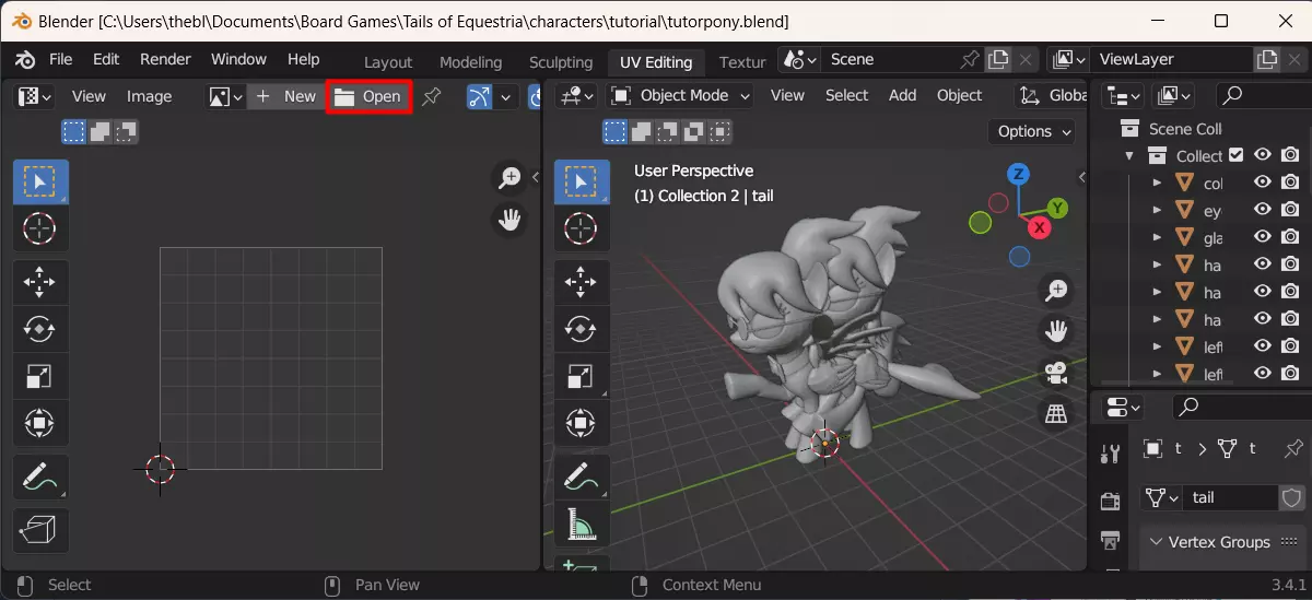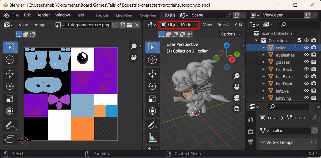 接下来,查看纹理文件,并考虑每个组件的大小。在我们的案例中,除小马身体纹理外,所有纹理的尺寸均相同,每个纹理占整体图像高度和宽度的四分之一。现在我们需要选择所有具有相同纹理尺寸的网格。按住“Ctrl”键可以同时选择多个对象。先点击第一个对象,然后按住Ctrl键,依次点击其他对象。