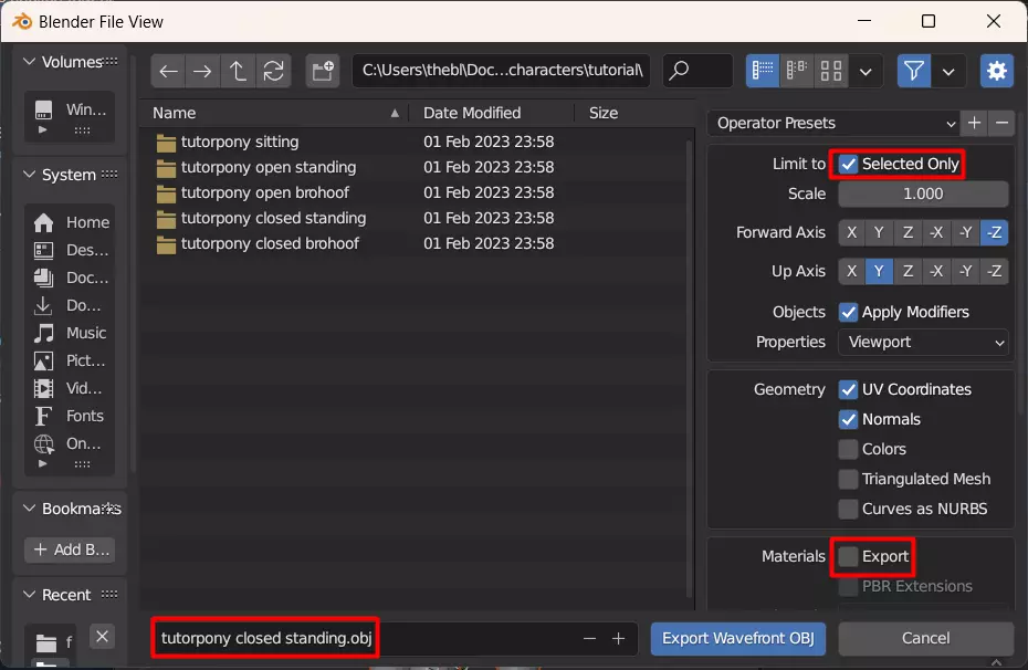 使用能识别小马和姿势的名称,并确保勾选“仅选择项”,取消勾选“材质导出”。