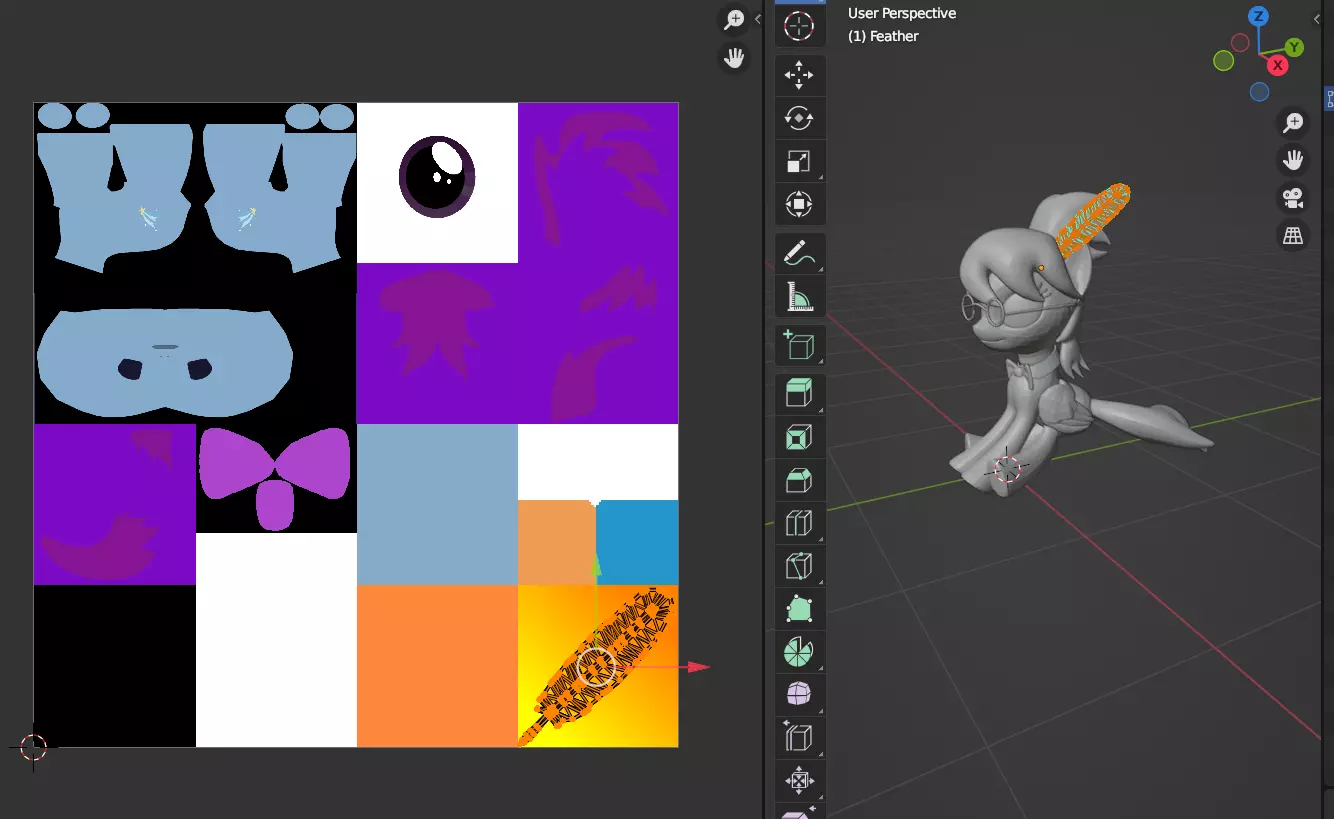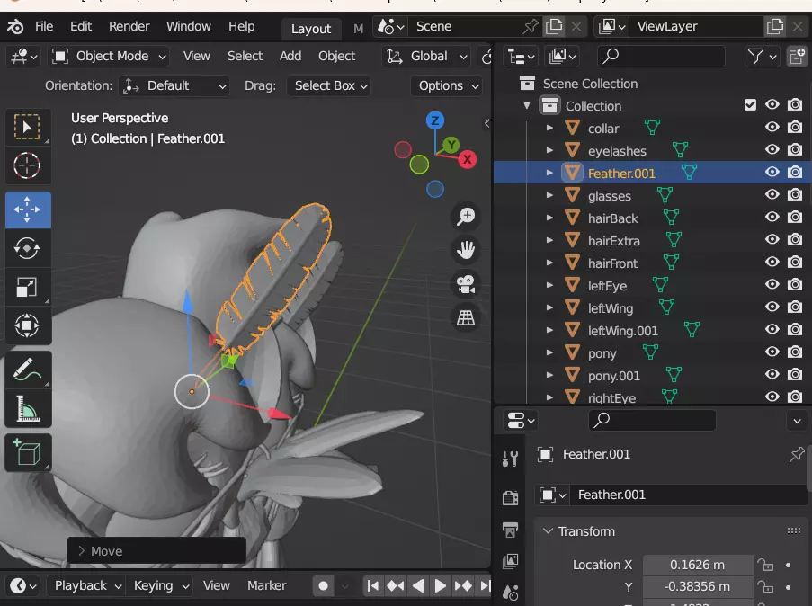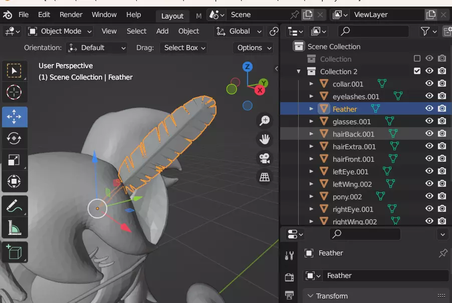 还可以进行其他添加,比如在头发上添加一根羽毛。如果你想这样做,可以在SketchFab上找到模型,将其导入Blender,然后旋转并移动到合适位置。
