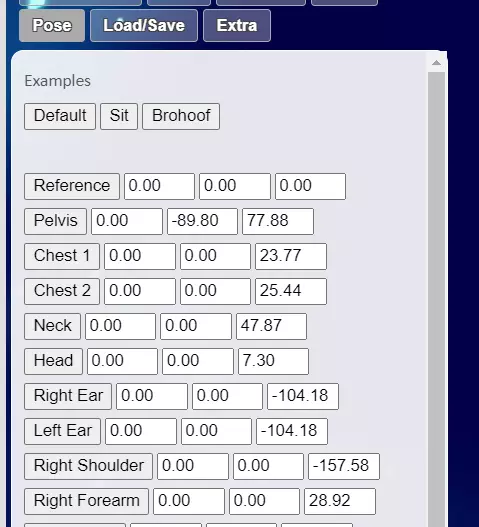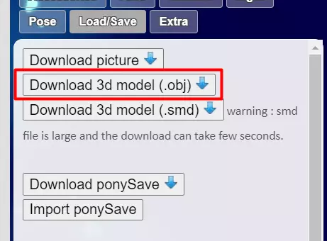 小马创建器内置了三种姿势,这是个不错的起点。点击“默认”(务必点击“默认”,不要想当然地认为它已经处于默认状态,一定要点击),然后返回保存/加载选项卡,点击“下载3D模型(.obj)”。