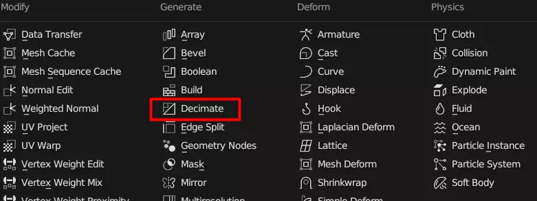 在这里,你会看到多个工具。选择“简化(Decimate)”。