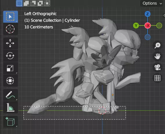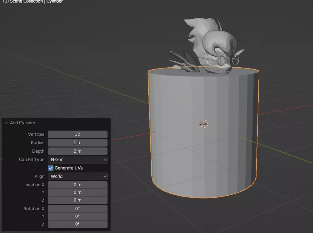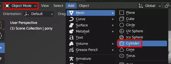 具体来说,“蹄击”姿势要求模型仅用三只蹄站立。因此,模型会处于不平衡状态。我们可以通过为模型添加一些不可见的支撑来解决这个问题。你可以用任何方式来实现,但我更倾向于使用简单的圆柱体网格。在物体模式下,点击“添加”->“网格”->“圆柱体”。