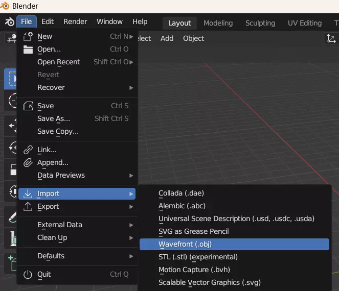 选中右侧框中的全部三个,然后按删除键。接着,你需要开始导入obj文件。操作步骤为:文件 -> 导入 -> Wavefront(.obj)