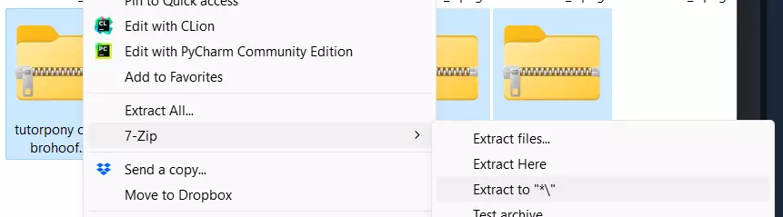 之后,如果你还想添加其他姿势或面部表情,尽管尽情尝试。但需要注意,无法保证它们都能正确导出。不知为何,小马创建器在导出闭眼等特定效果的OBJ文件时表现不佳。不过你可以多做尝试,看看哪些能成功导出,也许你会比我运气好。如果你制作了自定义姿势,记得同时下载对应的小马存档。 完成这一步后,你将得到3到6个(也可能更多)压缩文件,每个文件包含大约24个文件。不过不用担心,我们很快就会整理好这些文件。 步骤0.5:提取并清理导出文件 选中所有压缩文件,右键点击,使用7-zip,点击“解压到当前文件夹”来提取所有文件。