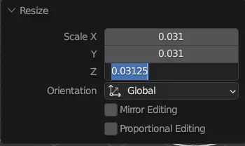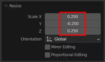 这里是我们输入所需数字的地方。现在,我们需要新的高度和宽度为整体图像高度和宽度的四分之一,而四分之一就是0.25。所以,在X和Z框中输入0.25,在Y框中输入-0.25,以翻转地图。