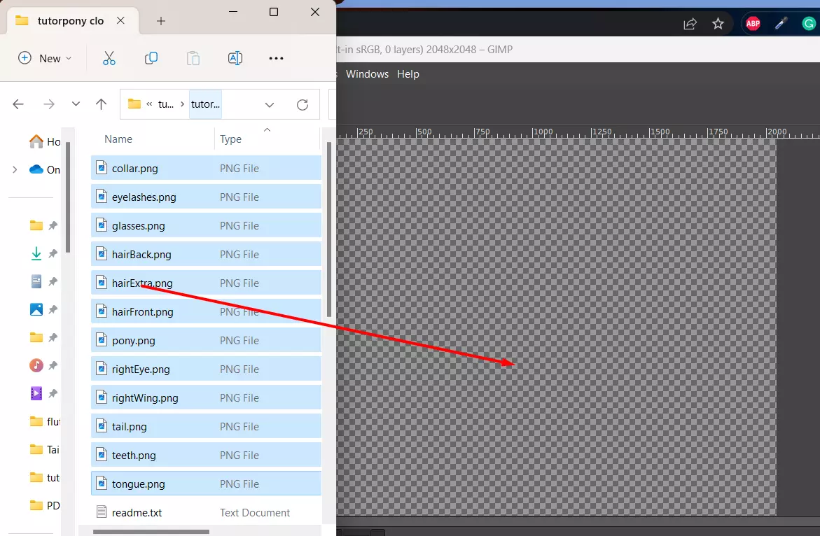 前往你在上一步选择的优先姿势文件夹。所有的png文件都应在那里。全选这些文件并将它们拖入GIMP的主界面。