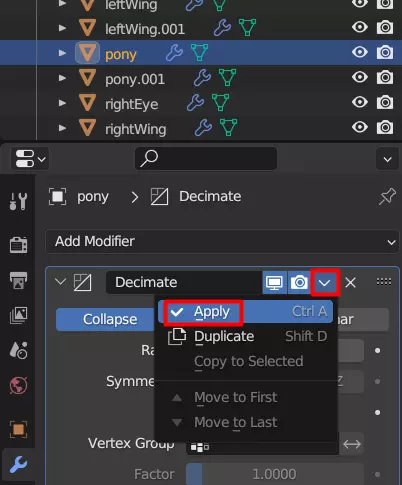 接下来,我们将处理碰撞层。 步骤7:减少多边形数量 现在是创建碰撞层的时候了。 理论上,我们可以直接使用上一步创建的主网格,但如果这样做,游戏可能会开始卡顿,尤其是在低配置电脑上。 不过幸运的是,有一个简单的解决方法,那就是减少多边形数量。因为目前模型有超过10000个多边形需要物理引擎处理。减少多边形数量将显著提高帧率。 Blender有一个工具可以轻松实现这一点,即简化工具。 选择列表中的第一个网格,然后点击下方面板中的扳手图标,接着点击“添加修改器”。