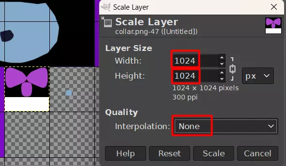 在这种情况下,我们有足够的空间将所有较小的项目放大到1024×1024。所以我们就这么做。你选择多大尺寸无关紧要,但要确保不要缩小任何图层,所以我们选择的只是一个最小尺寸,并且高度和宽度相等且为2的幂。你还需要将插值设置为“无”。