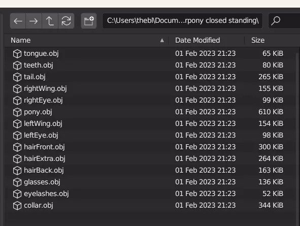 你需要逐个打开这些文件。Blender 没有批量打开它们的功能,所以这是唯一的方法。 双击第一个文件。然后回到“文件”->“导入”->“Wavefront (.obj)”,由于应该仍在同一个文件夹中,双击第二个文件。继续此操作,直到导入整个文件夹。