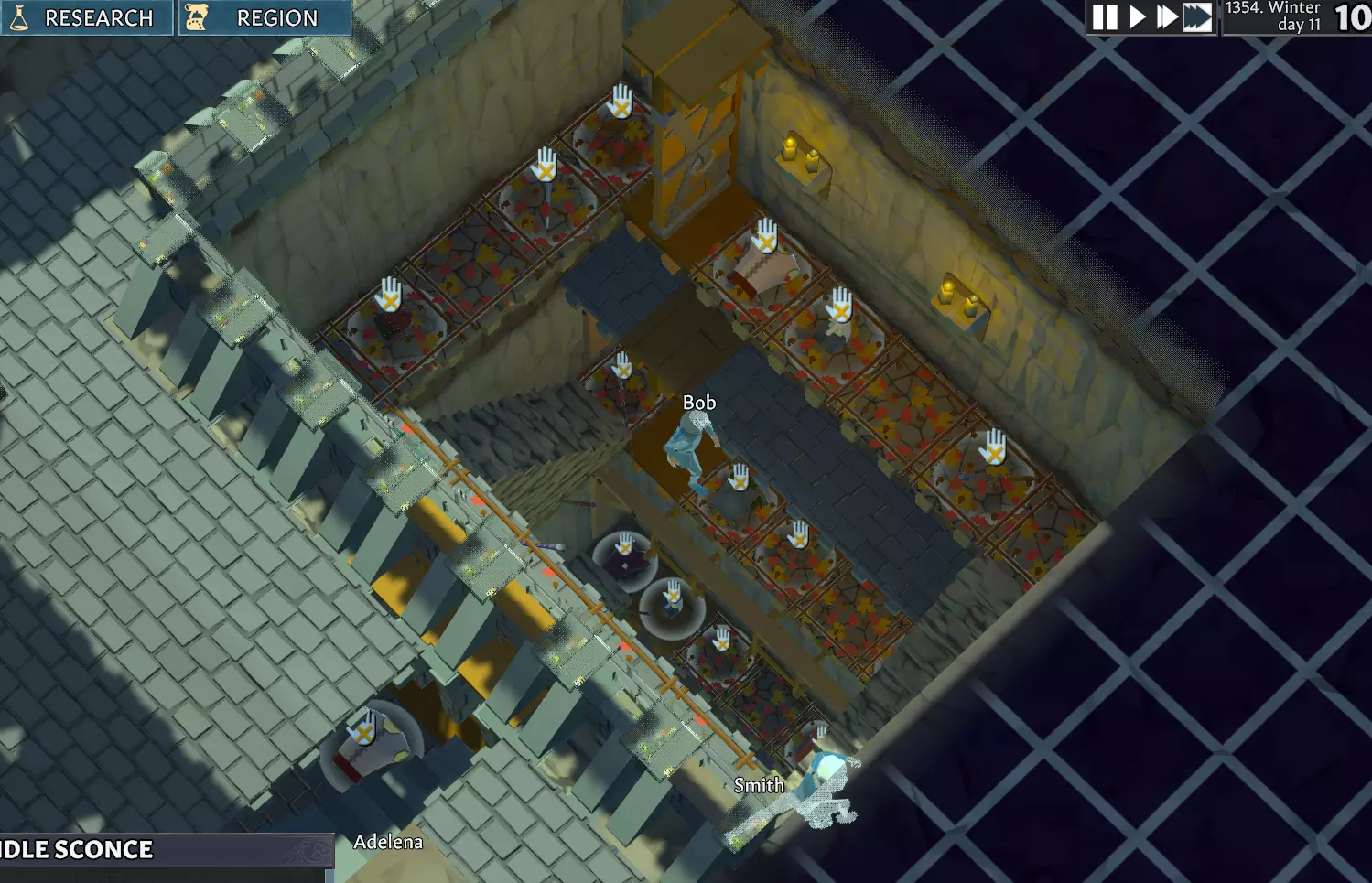 蓝色方块是墙壁,用于创建门口空间。起初挖掘比较耗时,但从长远来看能节省大量时间。好处是如果挖进山体内,还能产出大量石灰岩。注意:挖掘会破坏其上方的所有东西,比如金矿或铁矿层。建造地下室:完成挖掘后,你需要建造地下室。使用黏土墙,并将其放置在挖掘区域旁边的泥土下方。