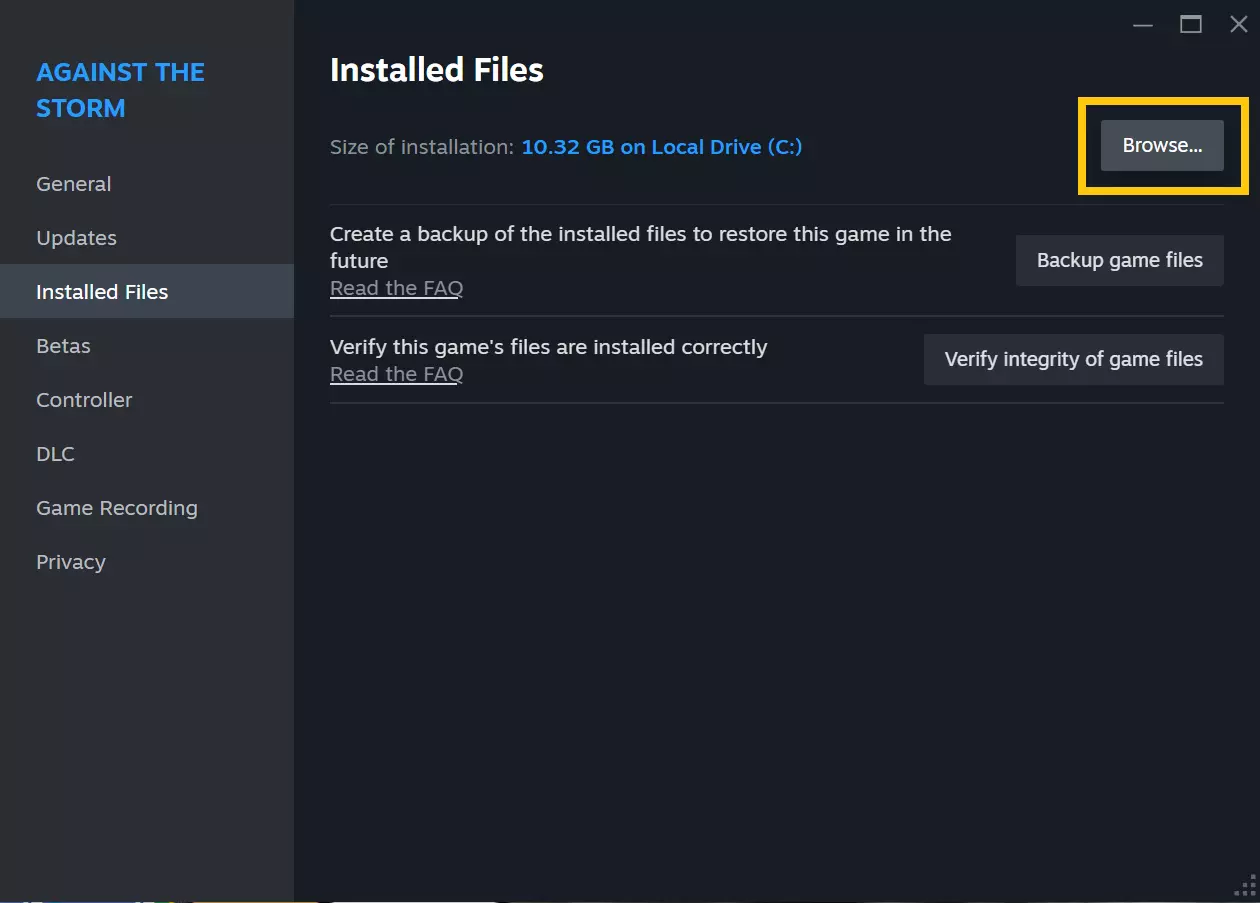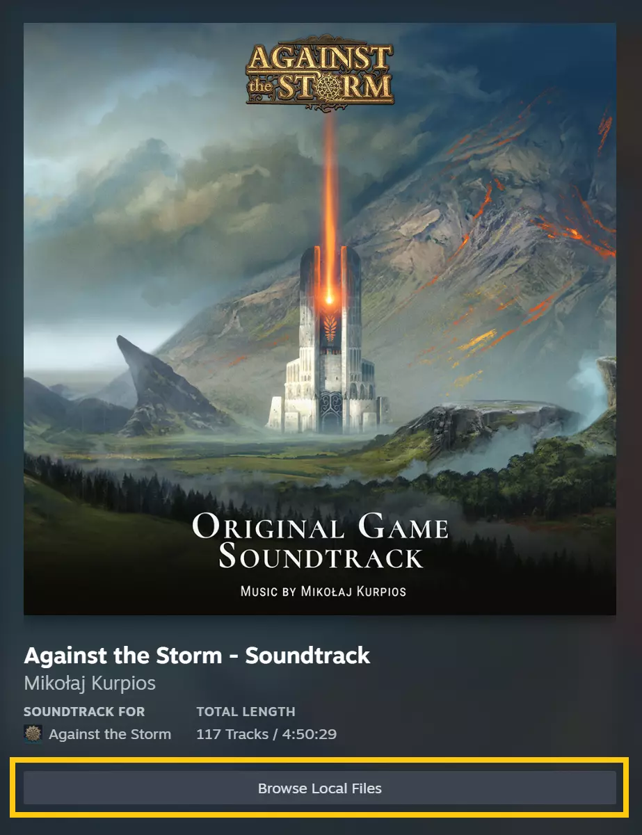 要访问驱动器上的音乐文件,请在您的Steam库中打开《逆风停航》原声音乐,然后选择“浏览本地文件”。