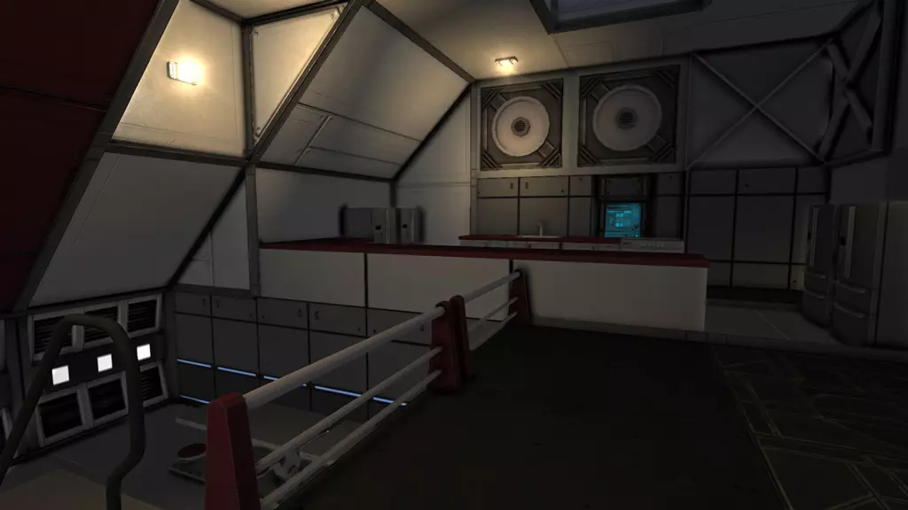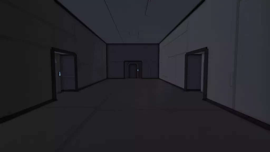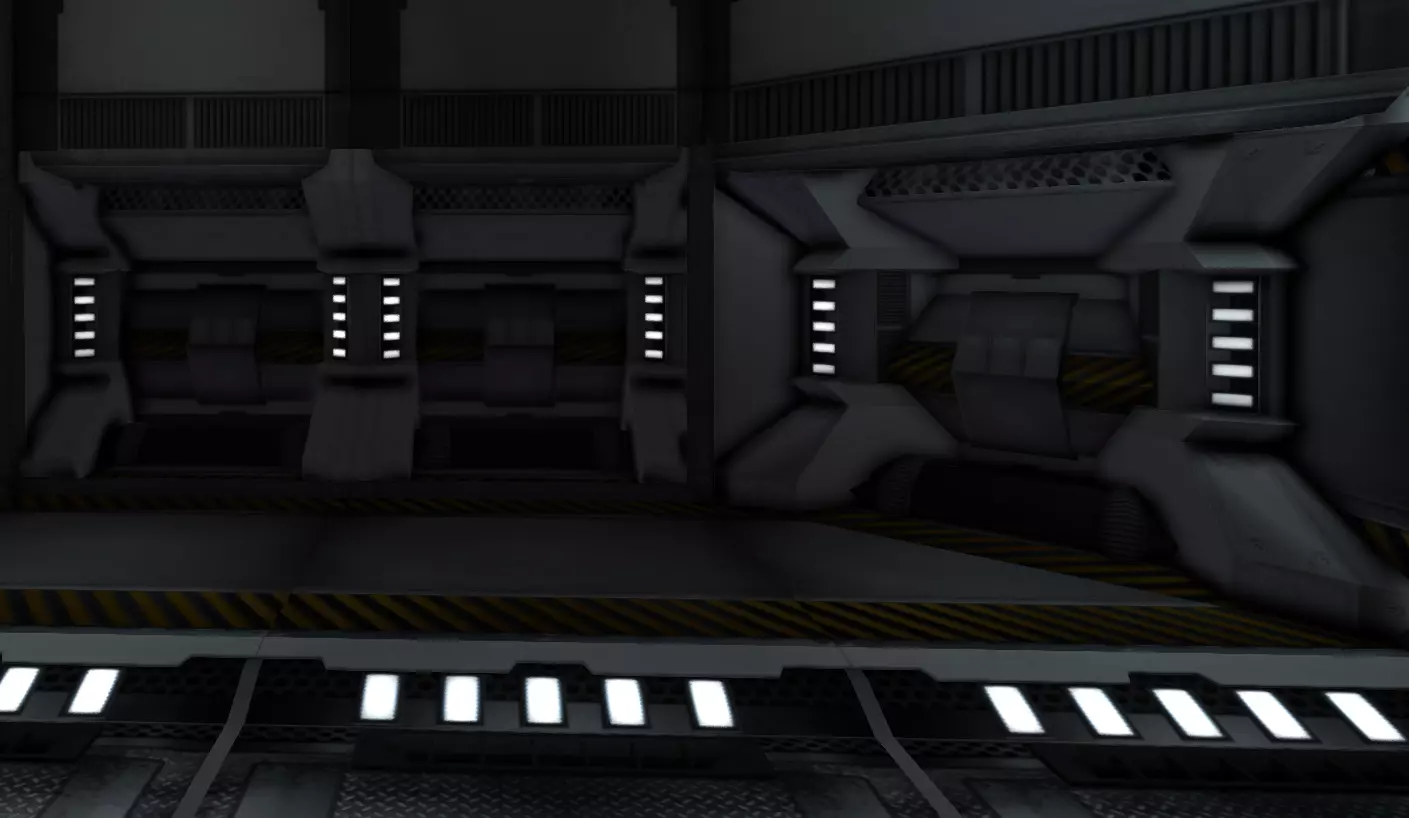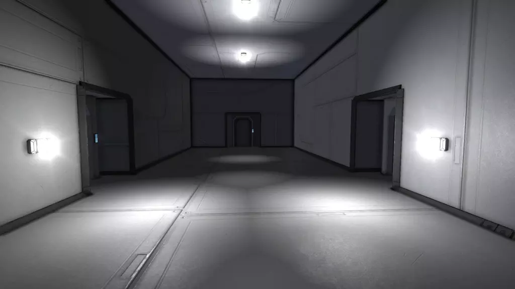 光照 除非你使用像“漆黑”天空盒这样的模组,否则你的世界其实并不需要额外添加光源。游戏中的标准环境光设置会照亮所有物体,从实际角度来说,(聚光)灯基本已无必要。游戏中不存在真正的黑暗。 [2015年7月注]:现在情况已不完全如此。如果你使用DX 11模式,环境会变得非常黑暗,此时房间内的照明就变得至关重要了。由于灯光的最大射程相当短,仅为10米(在游戏中仅相当于4个大型方块的长度),要为机库这类非常大的房间提供合适的照明实际上颇具挑战。不过,在机库的地板和天花板上安装灯光通常就能解决问题。 但无论如何,灯光作为装饰用途依然非常出色。又是我们这条无聊的老走廊,这次灯亮着。