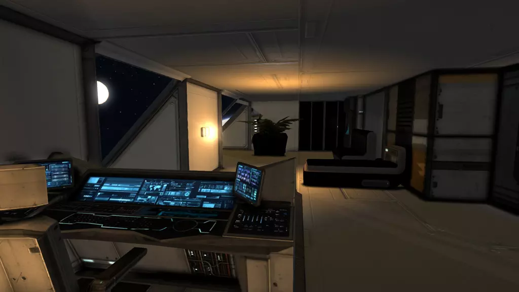 船长室。里面有一张工作台、一张床和一张沙发。所有船员舱室均使用黄色灯光,营造出温馨的氛围。
