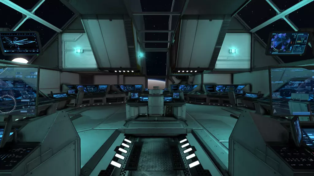 舰船舰桥。正如我们对科幻舰桥的预期,这里布满了控制台。蓝色灯光营造出一种冰冷的科技感。