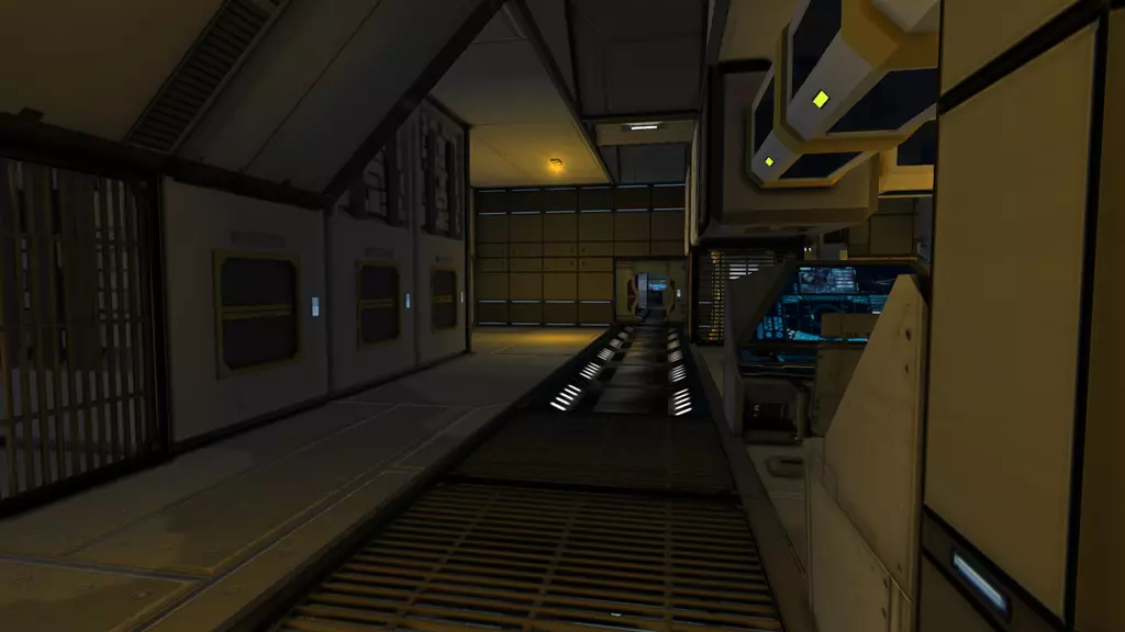 如你所见,这里有用于新墙体方块的模组。有些模组会添加功能性方块,比如门或驾驶舱,它们的功能与原版方块相同,但外观要好看得多。还有些模组会添加非常实用的装饰性家具,例如床、架子、栏杆、标牌等。上图使用了以下模组:Hammerman Decorations(大部分墙体、部分地板,以及悬挂在门上方的超细节1x1斜坡);Kolt16 Grated Floors(用于格栅地板。我在站立的走廊下方安装了一个走廊的副本,这样玩家就能透过格栅看到一些有趣的东西)。如果你想装饰一艘拥有多层甲板的飞船,这是个非常棒的效果——只需在上方甲板的地板上安装一些格栅,两层甲板都会显得更加宽敞有趣。 对接环 用于走廊尽头的气闸门。 推荐模组 我创建了一个Steam合集,里面包含了所有我喜欢的模组,其中大部分都围绕室内设计展开。 这些模组都很棒,而以下是我最爱的几个: 墙体方块 Hammerman Decorations(由Shaostoul维护) 包含一些细节极其丰富的走廊方块,包括1x1斜坡。其中一个1x1斜坡看起来科技感十足,我经常用它来模拟复杂的机械装置,完全超出了其原本的走廊使用意图。所有方块均为多纹理方块,与游戏原版的室内墙壁相同。