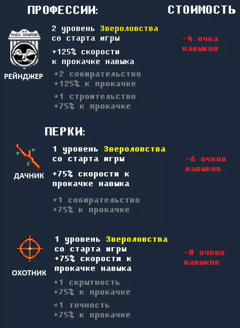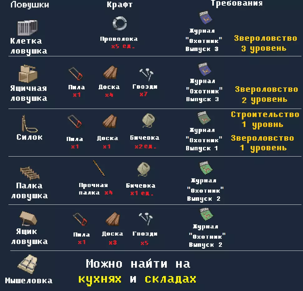“野外生存”节目,通过该节目可以快速获得“驯兽”技能的经验。已经错过了这期节目?没关系!你可以找到录制该节目的VHS录像带,其名称为“VHS 野外生存 第6集”。VHS录像带可以在书架和VHS录像带商店中找到。有时狡猾的小动物和鸟类会直接吃掉诱饵而不落入陷阱(尤其是在狩猎技能等级较低时经常发生这种情况),但不要灰心,要仔细留意陷阱中诱饵的情况,不过更糟糕的是,这些狡猾的家伙甚至可能弄坏你的陷阱。松鼠和兔子只能在晚上19:00到5:00之间用陷阱捕捉。沿着道路行走时,你可能会遇到营地。猎人们,这个营地可能配备有火器,也可能设有可借用的陷阱。