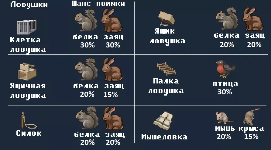 提示 请务必在森林中放置陷阱,那里动物出现的速度要快得多。可以通过右键点击进行地形侦察来判断自己的位置,道路上的陷阱是无效的。 在升级狩猎技能之前,请阅读不同的狩猎相关书籍。