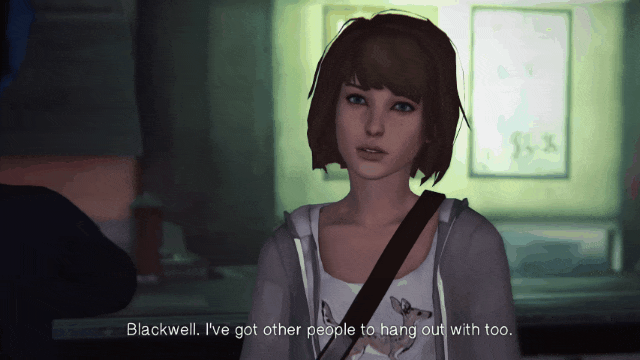 第一章 克洛伊会离开房间,并且不会给麦克斯看枪。在灯塔旁的对话中,克洛伊会生气。 第一章 克洛伊会很高兴。克洛伊会给麦克斯看枪。在灯塔旁的对话中,克洛伊会很开心。 第二章 克洛伊的母亲让麦克斯帮忙照看她的女儿。在校长办公室,麦克斯不会被停学。 第二章 在校长办公室的对话中,麦克斯可能会被停学。要达成此结果,她必须:毫无理由地指责大卫骚扰凯特。指责内森持有枪支,且事先不告知校长此事。 第三章 在潜入布莱克威尔学院期间,克洛伊会向麦克斯提起那件事。如果麦克斯决定站在克洛伊这边,乔伊斯在与大卫交谈后会提到吸烟的事。第三章 在潜入布莱克威尔学院期间,克洛伊会拿麦克斯和大麻的关系开玩笑。如果麦克斯选择站在克洛伊这边,在与大卫交谈后,乔伊斯会提到吸烟的事。 第四章 如果麦克斯没有删除克洛伊座机上的留言,大卫会给贝瑞警官发邮件,并提到克洛伊吸食大麻。 第四章 如果麦克斯没有删除克洛伊座机上的留言,大卫会给贝瑞警官发邮件,并提到麦克斯吸食大麻。 第五章 大卫会给她起“瘾君子”和“大麻鬼”这样的绰号。 第二章:时不我待