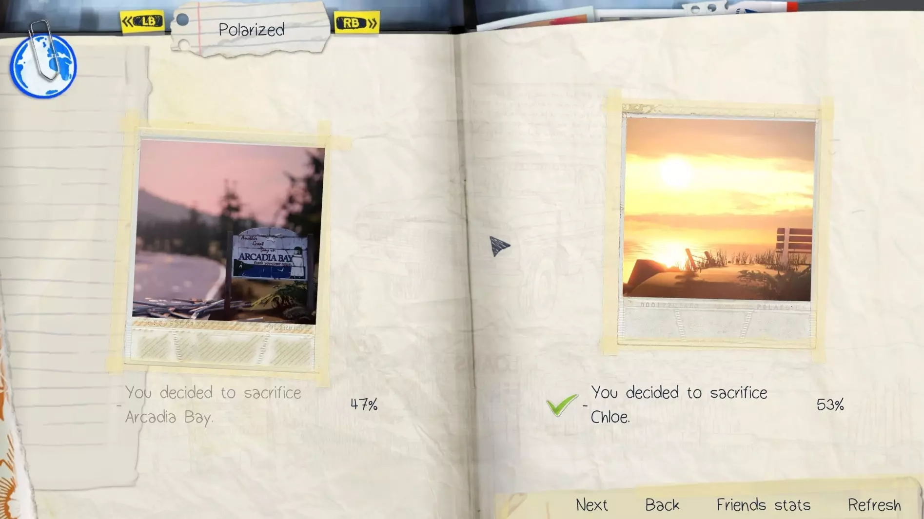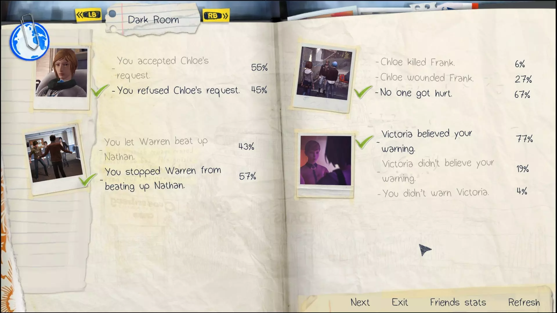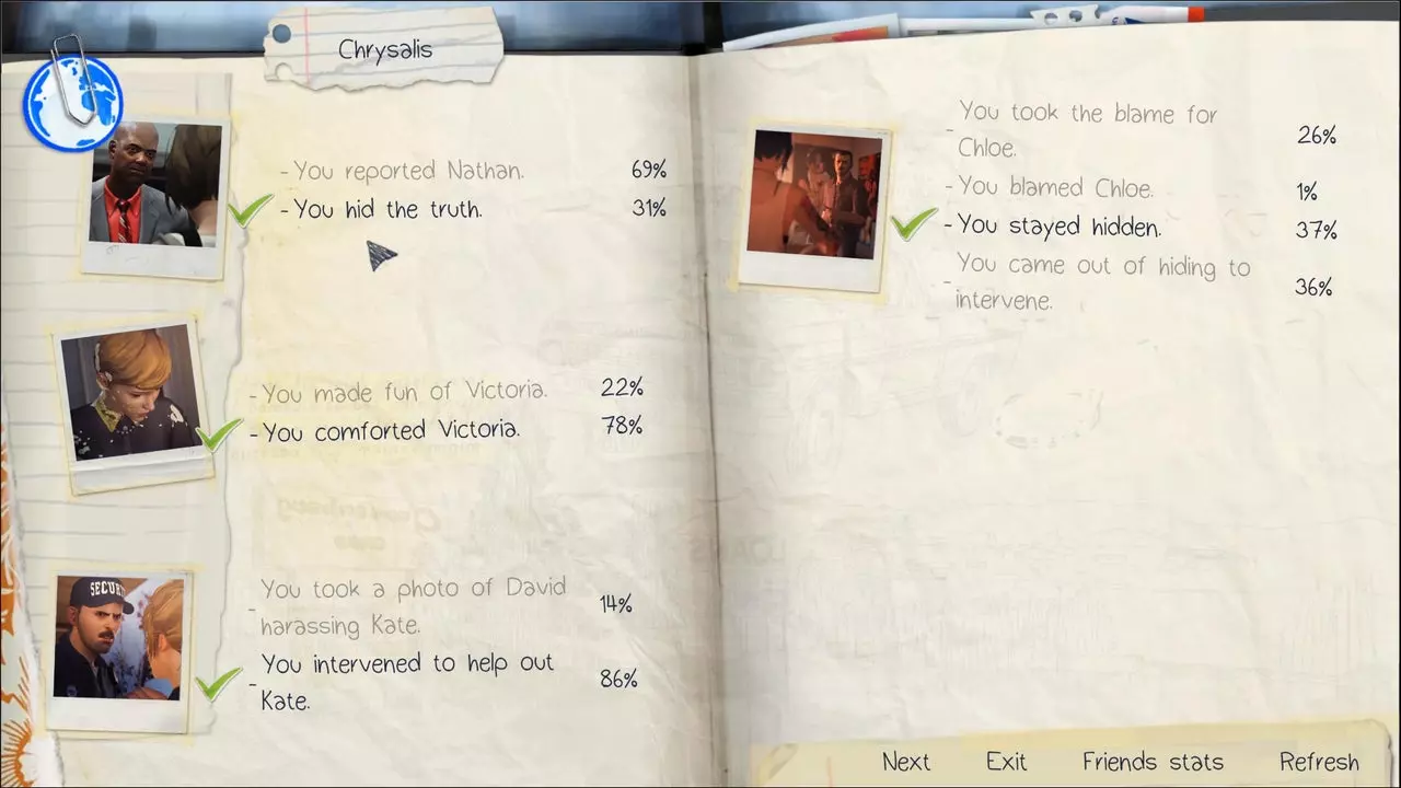 在平行现实中选择拒绝或接受帮助克洛伊死亡。阻止沃伦,或让他继续在宿舍里殴打内森。与弗兰克交谈时,选择正确答案,导致他死亡、受伤或所有人平安无事。参加派对时,说服维多利亚小心内森、不说服她,或完全不与她交谈。重要选择 #1