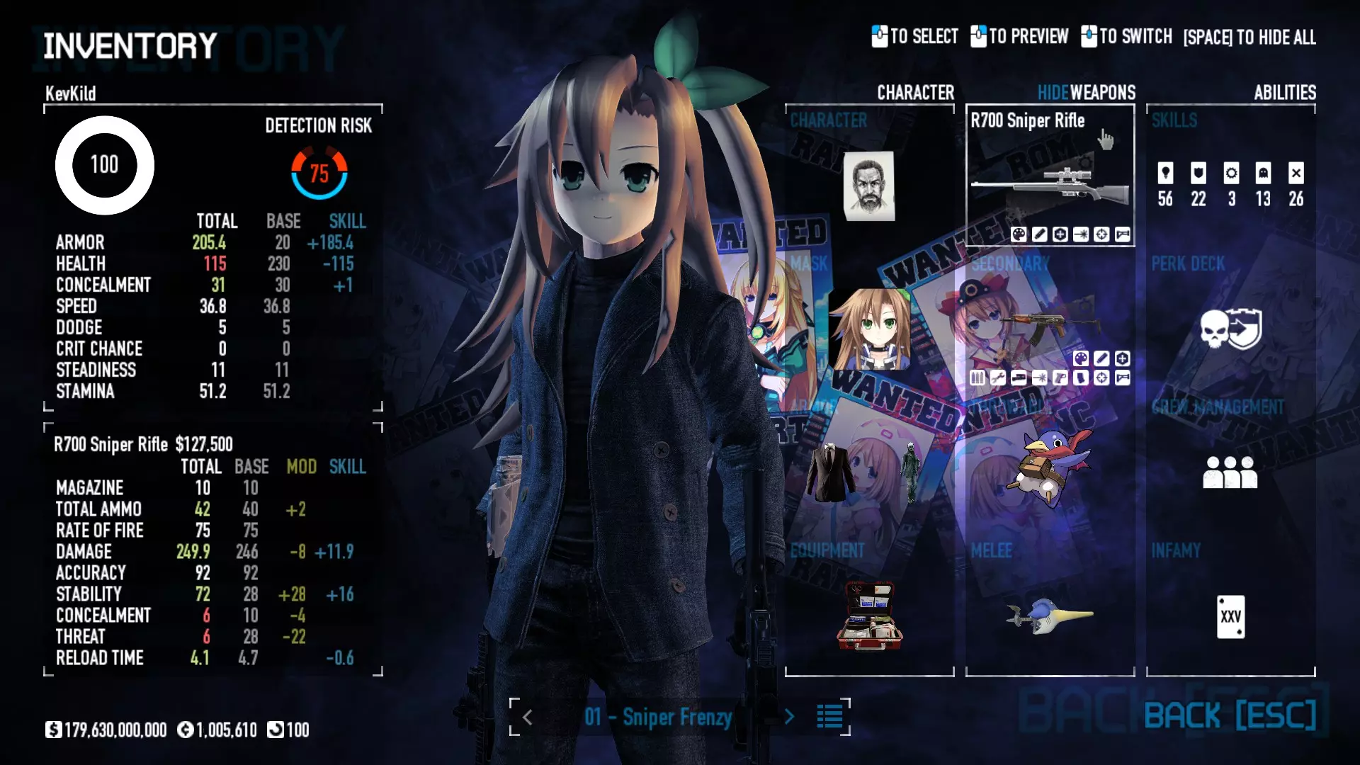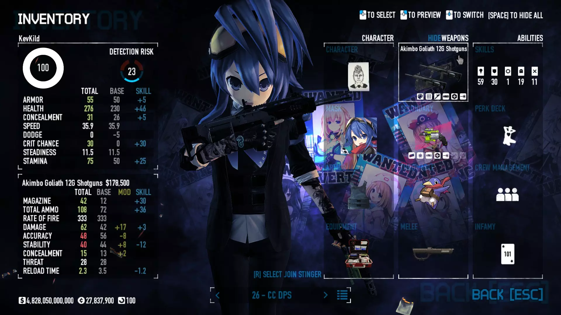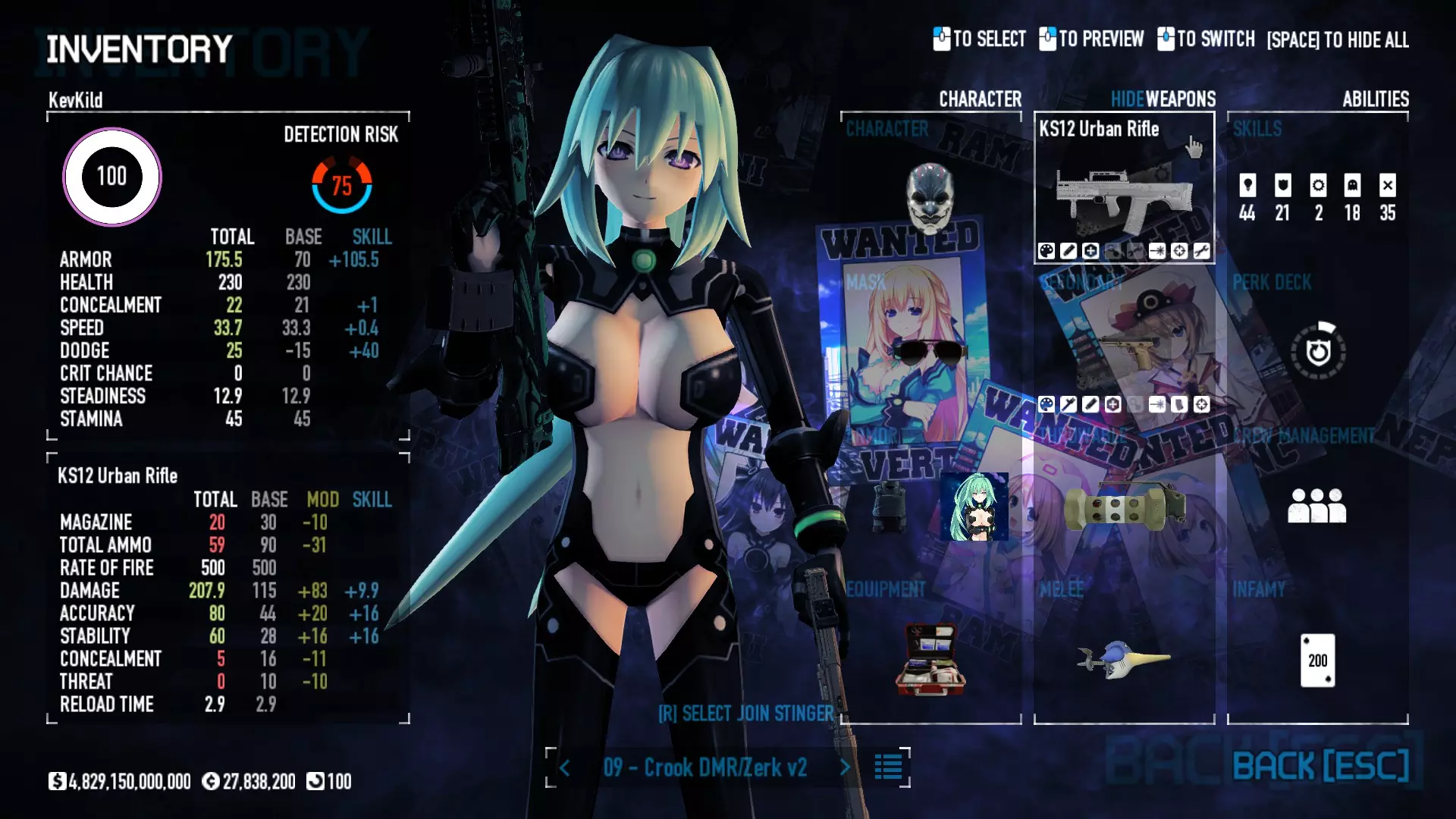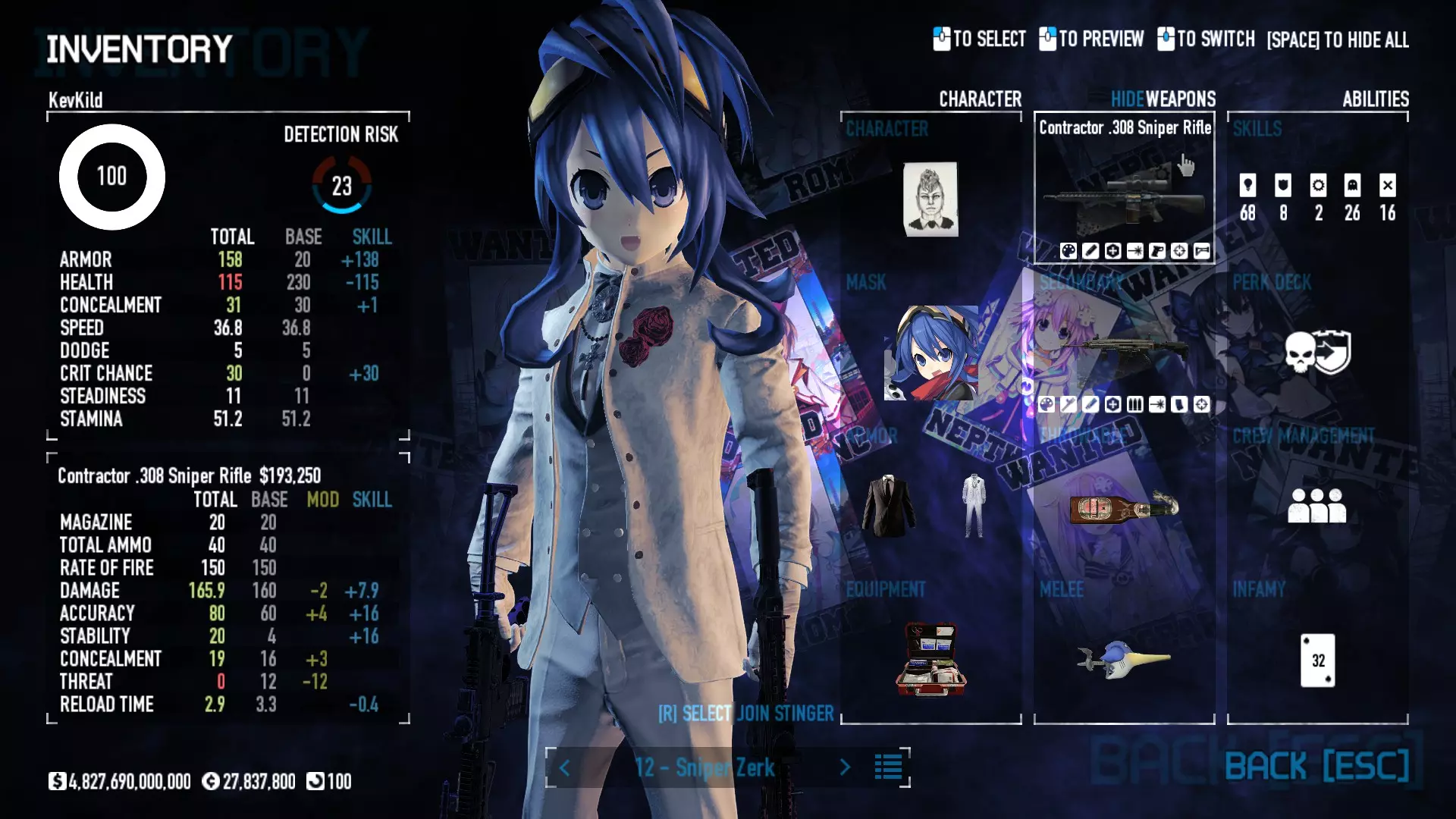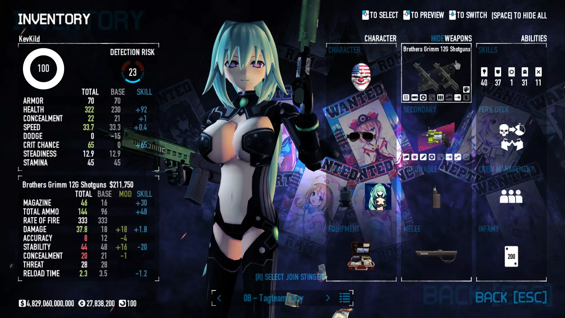 Secondary Weapon Grimm 12G Shotgun Attachments Dragon’s Breath Round Shark Teeth Nozzle Boost – Team Boost Auto Fire LED Combo Big Brother Magazine Compact Holosight – Dot 2Equipment Armor: Suit Deployable: Trip Mine & Doctor Bag Throwable: Concussion Grenades Melee: Buzzer/Electrical Brass KnucklesNotes & Videos Carry Potential: Transports Only https://pd2builder.netlify.app/?s=1G1e10d0e110383g00120150-4h00&p=e&a=0&t=4&d=3 You could run this as support build for saw-able heists, but wasted DPS potential Mod Link Section Moved my PasteBin section here for convenience and if anyone wants to play with above builds. == mods Folder == SuperBLT[superblt.znix.xyz] BeardLib[modworkshop.net] VanillaHUD Plus[modworkshop.net] VoidUI[modworkshop.net] FreeFlightCam[modworkshop.net] Low Violence Mode[modworkshop.net] Music Control[modworkshop.net] AntiCrash[pd2mods.z77.fr] NoScreenShake(Shooting)[modworkshop.net] Cloaker Camera Kick Disable[modworkshop.net] More Skill/Profiles[modworkshop.net] BagTilt Disable[modworkshop.net] CrimeNET Border removal[modworkshop.net] Skill Tree Background[modworkshop.net] Tast's DayNight Changes[modworkshop.net] LabRats Blankets[modworkshop.net] AutoFire SFX Fix[modworkshop.net] Sensitivity Fixer[modworkshop.net] No Down Counter[modworkshop.net] Mute Menu Contractors[modworkshop.net] == Assets Mod_overrides == Neptunia HyperHud[modworkshop.net] Neptunia Diff icons[modworkshop.net] Neptune Jacket Skin[modworkshop.net] Hoxton Evidence Room[modworkshop.net] Neptunia Breakout Screen[modworkshop.net] Neptunia GAGE Pack[modworkshop.net] Neptunia Alesso Heist[modworkshop.net] Neptunia Bank Texture[modworkshop.net] Neptunia Medic Bag[modworkshop.net] Neptunia FirstAid Kit[modworkshop.net] Neptunia Graffiti[modworkshop.net] Neptunia Trashbins[modworkshop.net] Neptunia Infamy Card[modworkshop.net] Neptunia PC screen[modworkshop.net] Neptunia Van[modworkshop.net] Nep Cloaker Spawn SFX[modworkshop.net] Nekopara Artgallery[modworkshop.net] Nekopara Lootbag[modworkshop.net] Nekopara Icons[modworkshop.net] Astolfo Body Bag[modworkshop.net] Astolfo Body Bag Case[modworkshop.net] BL2 Text/Hud[modworkshop.net] Touhou Interaction Circle - Modifed[modworkshop.net] Hikari Takanashi Glass SFX[modworkshop.net] 199.5 Sleeve Fix[modworkshop.net] HD-Texture Project[modworkshop.net] KizunaAI Sydney SFX[modworkshop.net] KizunaAI Mask Standalone[modworkshop.net] Sora AoS2 Mask Standalone[modworkshop.net] Shimakaze Mask Replacement[modworkshop.net] Neptunia Masks Standalone[modworkshop.net] Neptunia Masks - Teamwork[modworkshop.net] COD:MW2 Intervention Sound[modworkshop.net] COD:MW2 .50 Cal Sound[modworkshop.net] COD:MW2 M1014 Sound[modworkshop.net] COD:MW 2019 Gun SFX[modworkshop.net] Astolfo ICU drill[modworkshop.net] OwO Dozer[modworkshop.net] Portal Sentry[modworkshop.net] SONG:Touhou Pack1[modworkshop.net] SONG:Touhou Pack2[modworkshop.net] Ahegao Universal Skin[modworkshop.net] FEDNET Weapon Icons LEFT[modworkshop.net] Nepgear Commando 101[modworkshop.net] DSOD Nisa Mask Charm[modworkshop.net] DSOD Nisa Mask[modworkshop.net] KS12 Spinny Reload[modworkshop.net] LAS[modworkshop.net] Kizuna AI LAS[modworkshop.net] Gawr Gura LAS[modworkshop.net] Neptunia Characters LAS[modworkshop.net] Neptunia Characters LAS2[modworkshop.net] All my other mod_overrides MediaFire links are blocked by Steam. You can get them on my YouTube mod list video showcase. - Briefing Video removal - SecurityCams, First Weeb Bank, Loading Screens 2019 - Nisa Mask - Nisa Mask (WithCape) - Nisa Pissed Mask - Nisa Sword Buzzer - Nisa Sword IcePick - Prinny Concussion ~ Created Mods ~ TripMine Houston[modworkshop.net] TripMine OOF[modworkshop.net] Cirno Theme remix[modworkshop.net] Marisa Theme remix[modworkshop.net] AoS2 Expendables[modworkshop.net] Remilia Theme remix[modworkshop.net] Momiji Theme remix[modworkshop.net] Flandre Theme remix[modworkshop.net] Grand Design[modworkshop.net] Other Great DSOD Guides My recommendation for other DSOD guides on Steam, as well as their content.