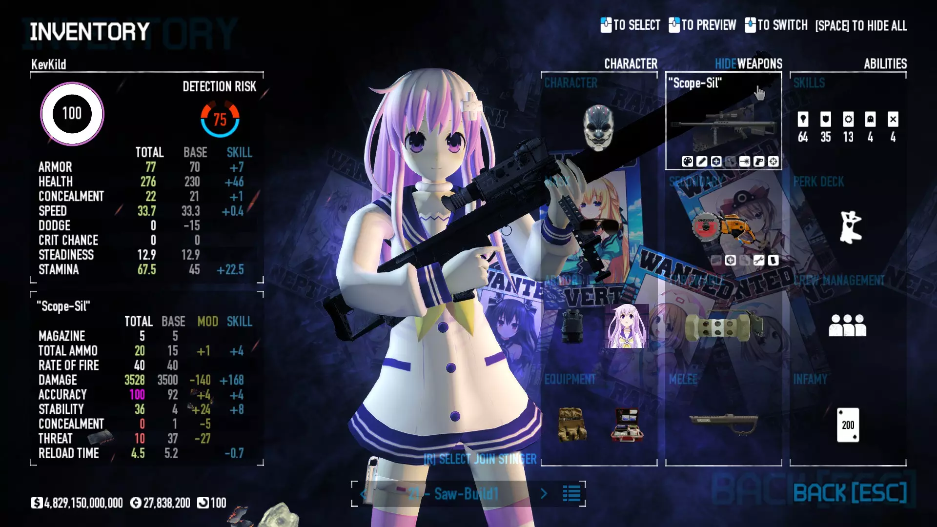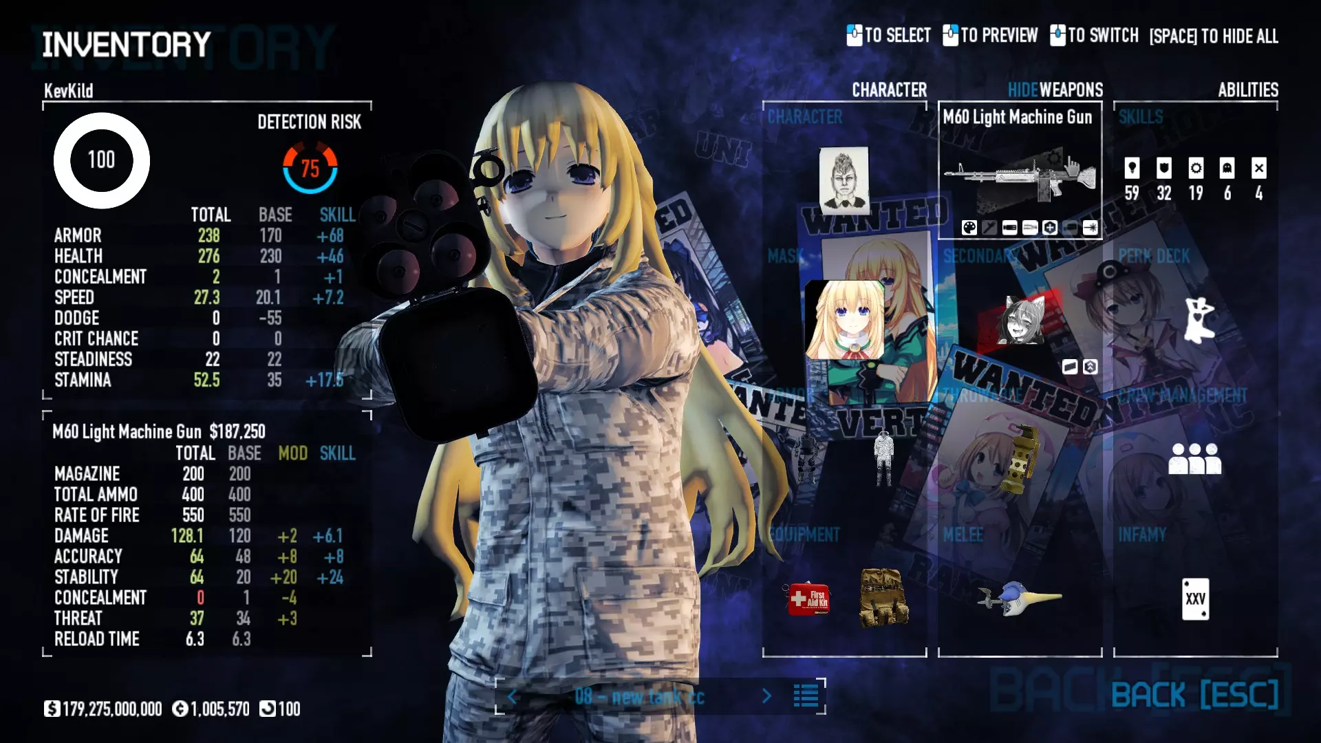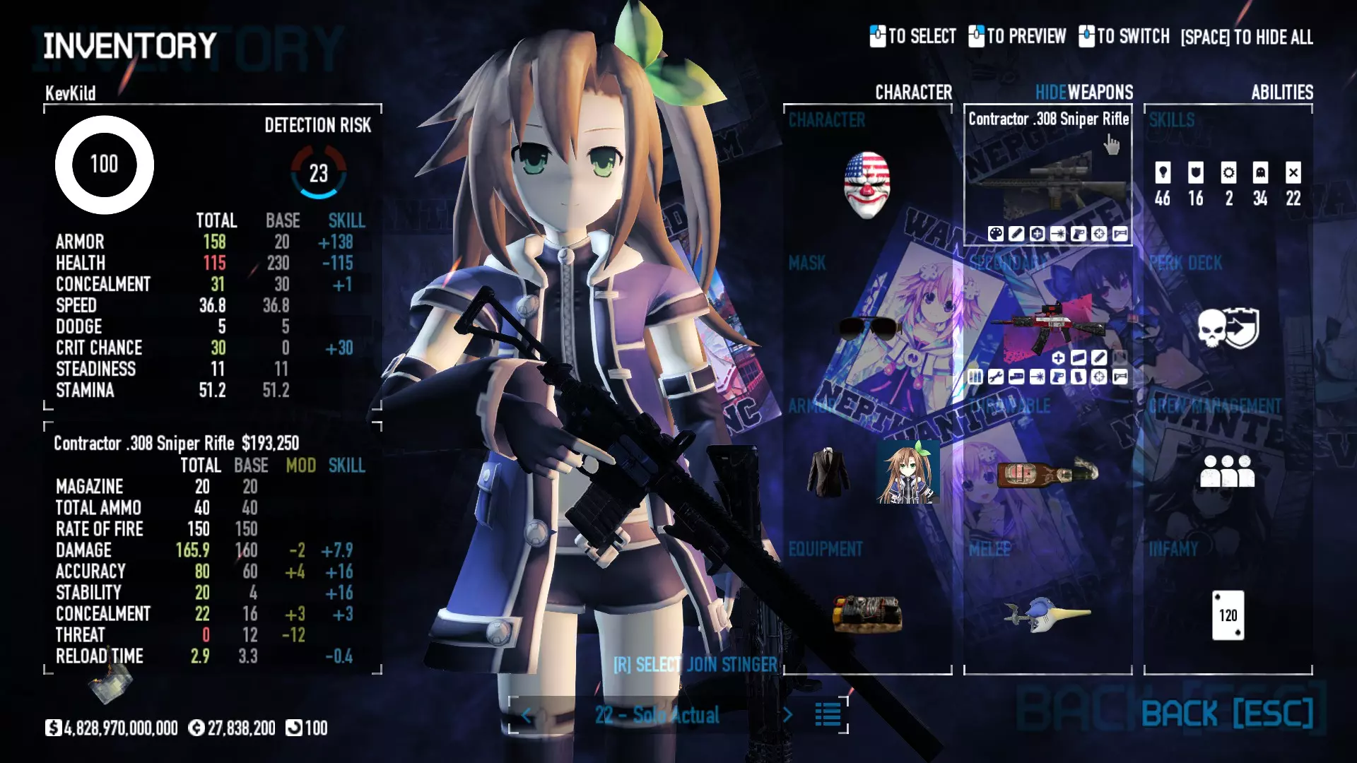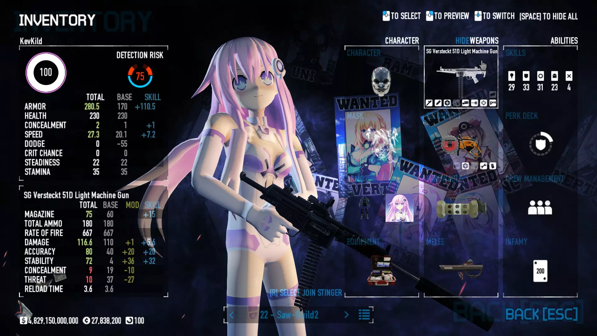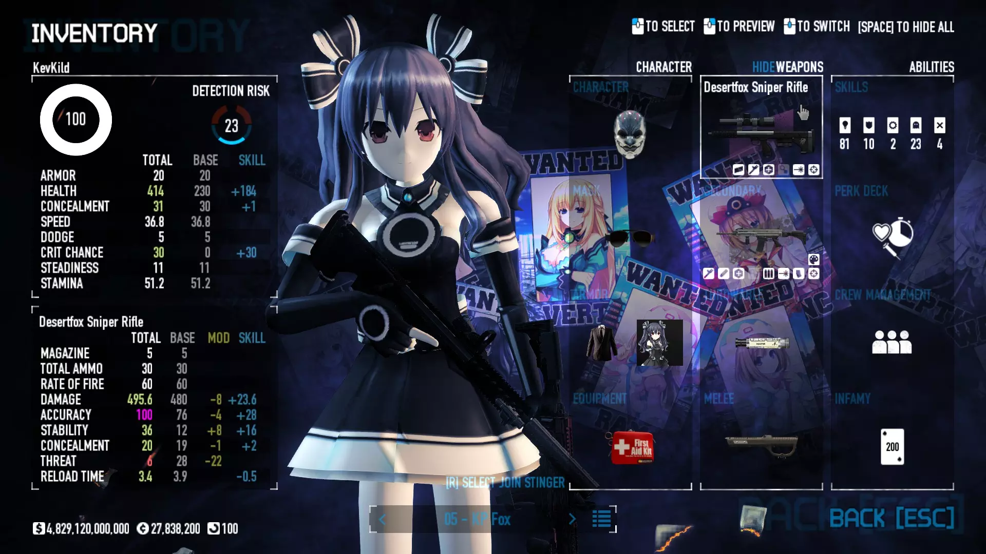 Secondary Weapon Grimm 12G Shotgun Attachments Dragon’s Breath Round Shark Teeth Nozzle Boost – Team Boost Auto Fire LED Combo Big Brother Magazine Compact Holosight – Dot 2Equipment Armor: Suit Deployable: Trip Mine & Doctor Bag Throwable: Concussion Grenades Melee: Buzzer/Electrical Brass KnucklesNotes & Videos Carry Potential: Transports Only https://pd2builder.netlify.app/?s=1G1e10d0e110383g00120150-4h00&p=e&a=0&t=4&d=3 You could run this as support build for saw-able heists, but wasted DPS potential Mod Link Section Moved my PasteBin section here for convenience and if anyone wants to play with above builds. == mods Folder == SuperBLT[superblt.znix.xyz] BeardLib[modworkshop.net] VanillaHUD Plus[modworkshop.net] VoidUI[modworkshop.net] FreeFlightCam[modworkshop.net] Low Violence Mode[modworkshop.net] Music Control[modworkshop.net] AntiCrash[pd2mods.z77.fr] NoScreenShake(Shooting)[modworkshop.net] Cloaker Camera Kick Disable[modworkshop.net] More Skill/Profiles[modworkshop.net] BagTilt Disable[modworkshop.net] CrimeNET Border removal[modworkshop.net] Skill Tree Background[modworkshop.net] Tast's DayNight Changes[modworkshop.net] LabRats Blankets[modworkshop.net] AutoFire SFX Fix[modworkshop.net] Sensitivity Fixer[modworkshop.net] No Down Counter[modworkshop.net] Mute Menu Contractors[modworkshop.net] == Assets Mod_overrides == Neptunia HyperHud[modworkshop.net] Neptunia Diff icons[modworkshop.net] Neptune Jacket Skin[modworkshop.net] Hoxton Evidence Room[modworkshop.net] Neptunia Breakout Screen[modworkshop.net] Neptunia GAGE Pack[modworkshop.net] Neptunia Alesso Heist[modworkshop.net] Neptunia Bank Texture[modworkshop.net] Neptunia Medic Bag[modworkshop.net] Neptunia FirstAid Kit[modworkshop.net] Neptunia Graffiti[modworkshop.net] Neptunia Trashbins[modworkshop.net] Neptunia Infamy Card[modworkshop.net] Neptunia PC screen[modworkshop.net] Neptunia Van[modworkshop.net] Nep Cloaker Spawn SFX[modworkshop.net] Nekopara Artgallery[modworkshop.net] Nekopara Lootbag[modworkshop.net] Nekopara Icons[modworkshop.net] Astolfo Body Bag[modworkshop.net] Astolfo Body Bag Case[modworkshop.net] BL2 Text/Hud[modworkshop.net] Touhou Interaction Circle - Modifed[modworkshop.net] Hikari Takanashi Glass SFX[modworkshop.net] 199.5 Sleeve Fix[modworkshop.net] HD-Texture Project[modworkshop.net] KizunaAI Sydney SFX[modworkshop.net] KizunaAI Mask Standalone[modworkshop.net] Sora AoS2 Mask Standalone[modworkshop.net] Shimakaze Mask Replacement[modworkshop.net] Neptunia Masks Standalone[modworkshop.net] Neptunia Masks - Teamwork[modworkshop.net] COD:MW2 Intervention Sound[modworkshop.net] COD:MW2 .50 Cal Sound[modworkshop.net] COD:MW2 M1014 Sound[modworkshop.net] COD:MW 2019 Gun SFX[modworkshop.net] Astolfo ICU drill[modworkshop.net] OwO Dozer[modworkshop.net] Portal Sentry[modworkshop.net] SONG:Touhou Pack1[modworkshop.net] SONG:Touhou Pack2[modworkshop.net] Ahegao Universal Skin[modworkshop.net] FEDNET Weapon Icons LEFT[modworkshop.net] Nepgear Commando 101[modworkshop.net] DSOD Nisa Mask Charm[modworkshop.net] DSOD Nisa Mask[modworkshop.net] KS12 Spinny Reload[modworkshop.net] LAS[modworkshop.net] Kizuna AI LAS[modworkshop.net] Gawr Gura LAS[modworkshop.net] Neptunia Characters LAS[modworkshop.net] Neptunia Characters LAS2[modworkshop.net] All my other mod_overrides MediaFire links are blocked by Steam. You can get them on my YouTube mod list video showcase. - Briefing Video removal - SecurityCams, First Weeb Bank, Loading Screens 2019 - Nisa Mask - Nisa Mask (WithCape) - Nisa Pissed Mask - Nisa Sword Buzzer - Nisa Sword IcePick - Prinny Concussion ~ Created Mods ~ TripMine Houston[modworkshop.net] TripMine OOF[modworkshop.net] Cirno Theme remix[modworkshop.net] Marisa Theme remix[modworkshop.net] AoS2 Expendables[modworkshop.net] Remilia Theme remix[modworkshop.net] Momiji Theme remix[modworkshop.net] Flandre Theme remix[modworkshop.net] Grand Design[modworkshop.net] Other Great DSOD Guides My recommendation for other DSOD guides on Steam, as well as their content.
