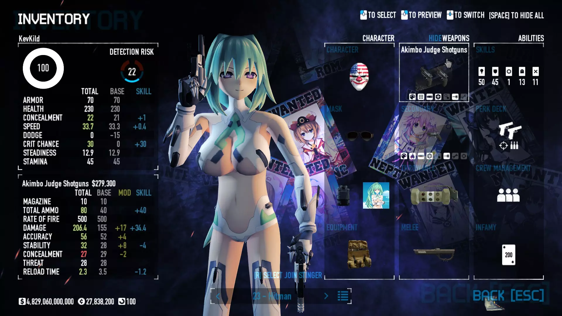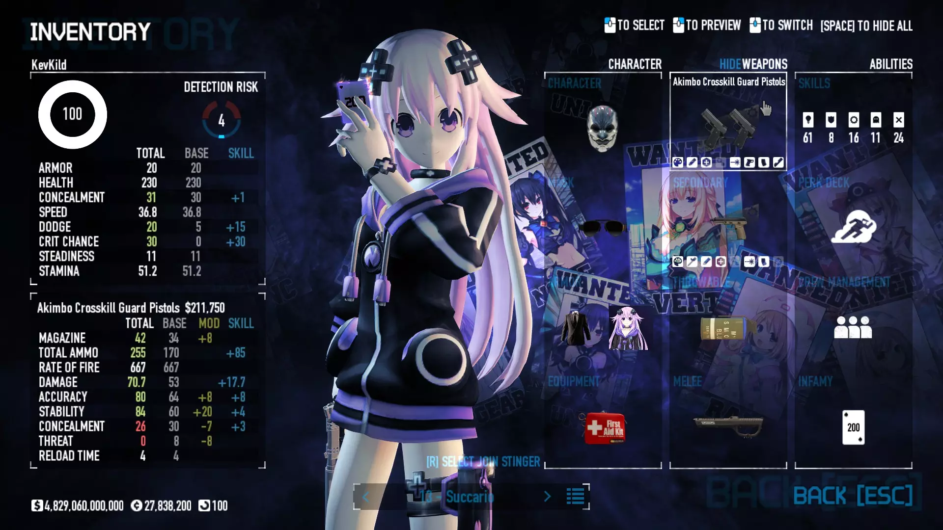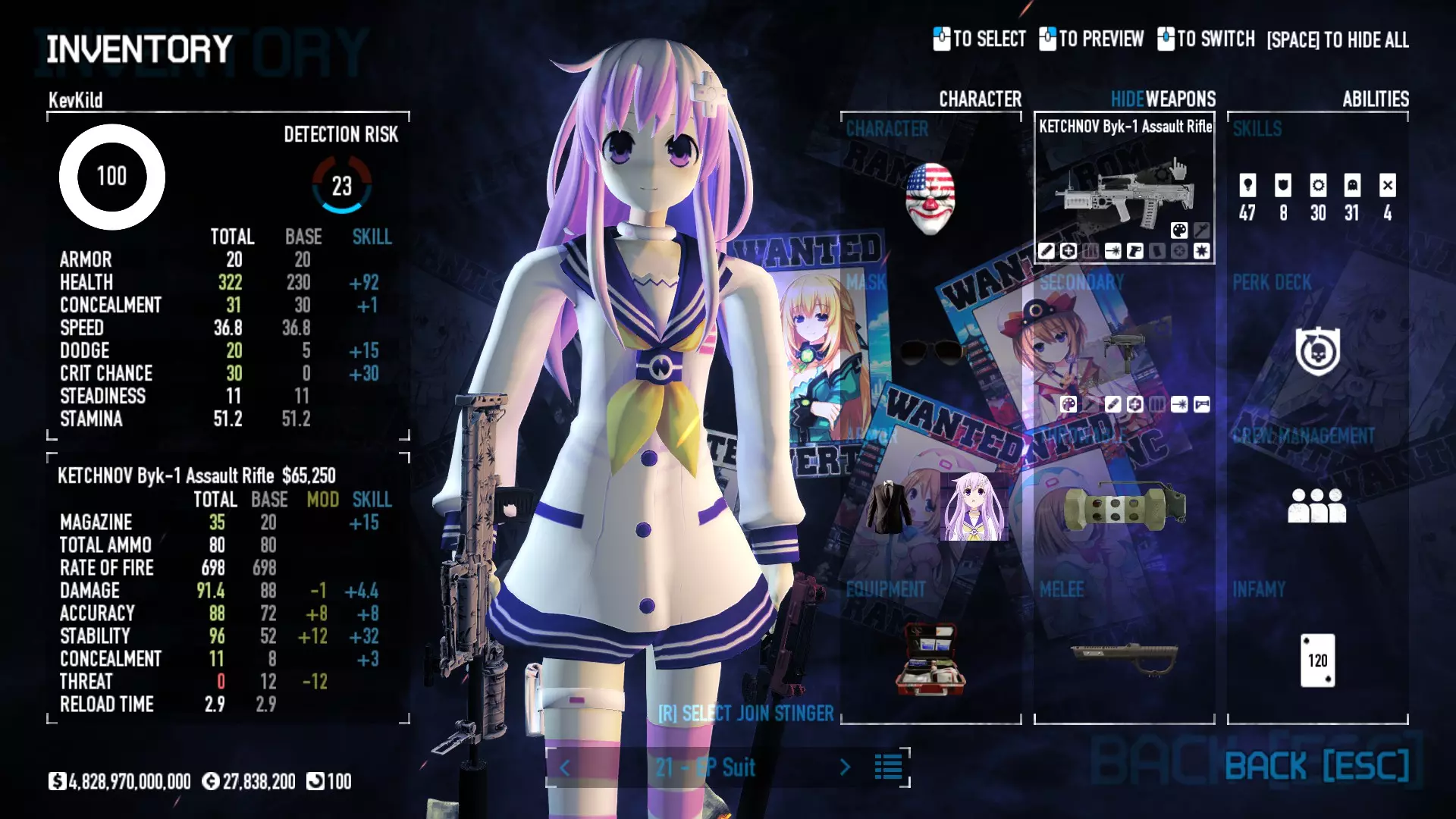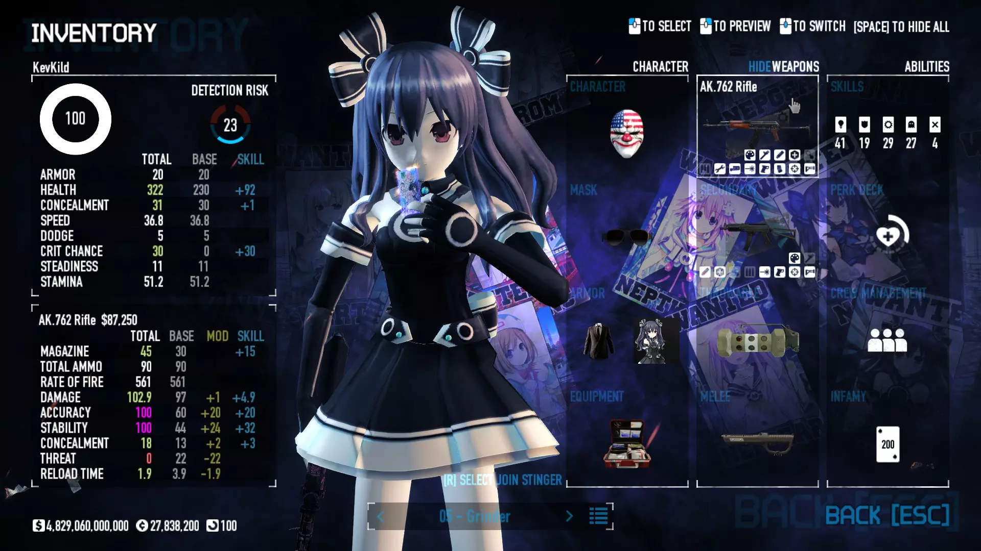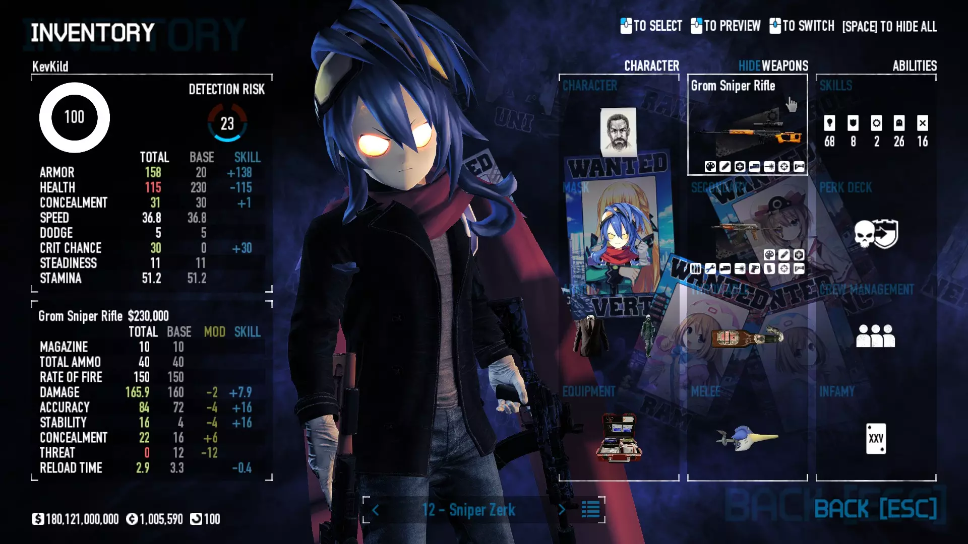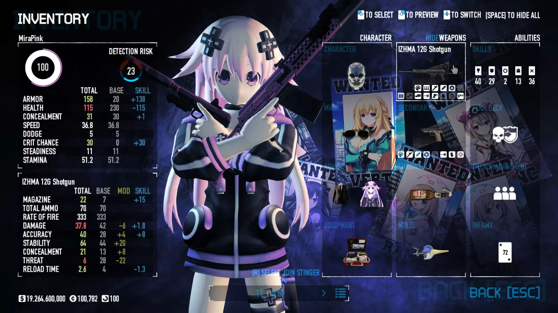 Secondary Weapon Grimm 12G Shotgun Attachments Dragon’s Breath Round Shark Teeth Nozzle Boost – Team Boost Auto Fire LED Combo Big Brother Magazine Compact Holosight – Dot 2Equipment Armor: Suit Deployable: Trip Mine & Doctor Bag Throwable: Concussion Grenades Melee: Buzzer/Electrical Brass KnucklesNotes & Videos Carry Potential: Transports Only https://pd2builder.netlify.app/?s=1G1e10d0e110383g00120150-4h00&p=e&a=0&t=4&d=3 You could run this as support build for saw-able heists, but wasted DPS potential Mod Link Section Moved my PasteBin section here for convenience and if anyone wants to play with above builds. == mods Folder == SuperBLT[superblt.znix.xyz] BeardLib[modworkshop.net] VanillaHUD Plus[modworkshop.net] VoidUI[modworkshop.net] FreeFlightCam[modworkshop.net] Low Violence Mode[modworkshop.net] Music Control[modworkshop.net] AntiCrash[pd2mods.z77.fr] NoScreenShake(Shooting)[modworkshop.net] Cloaker Camera Kick Disable[modworkshop.net] More Skill/Profiles[modworkshop.net] BagTilt Disable[modworkshop.net] CrimeNET Border removal[modworkshop.net] Skill Tree Background[modworkshop.net] Tast's DayNight Changes[modworkshop.net] LabRats Blankets[modworkshop.net] AutoFire SFX Fix[modworkshop.net] Sensitivity Fixer[modworkshop.net] No Down Counter[modworkshop.net] Mute Menu Contractors[modworkshop.net] == Assets Mod_overrides == Neptunia HyperHud[modworkshop.net] Neptunia Diff icons[modworkshop.net] Neptune Jacket Skin[modworkshop.net] Hoxton Evidence Room[modworkshop.net] Neptunia Breakout Screen[modworkshop.net] Neptunia GAGE Pack[modworkshop.net] Neptunia Alesso Heist[modworkshop.net] Neptunia Bank Texture[modworkshop.net] Neptunia Medic Bag[modworkshop.net] Neptunia FirstAid Kit[modworkshop.net] Neptunia Graffiti[modworkshop.net] Neptunia Trashbins[modworkshop.net] Neptunia Infamy Card[modworkshop.net] Neptunia PC screen[modworkshop.net] Neptunia Van[modworkshop.net] Nep Cloaker Spawn SFX[modworkshop.net] Nekopara Artgallery[modworkshop.net] Nekopara Lootbag[modworkshop.net] Nekopara Icons[modworkshop.net] Astolfo Body Bag[modworkshop.net] Astolfo Body Bag Case[modworkshop.net] BL2 Text/Hud[modworkshop.net] Touhou Interaction Circle - Modifed[modworkshop.net] Hikari Takanashi Glass SFX[modworkshop.net] 199.5 Sleeve Fix[modworkshop.net] HD-Texture Project[modworkshop.net] KizunaAI Sydney SFX[modworkshop.net] KizunaAI Mask Standalone[modworkshop.net] Sora AoS2 Mask Standalone[modworkshop.net] Shimakaze Mask Replacement[modworkshop.net] Neptunia Masks Standalone[modworkshop.net] Neptunia Masks - Teamwork[modworkshop.net] COD:MW2 Intervention Sound[modworkshop.net] COD:MW2 .50 Cal Sound[modworkshop.net] COD:MW2 M1014 Sound[modworkshop.net] COD:MW 2019 Gun SFX[modworkshop.net] Astolfo ICU drill[modworkshop.net] OwO Dozer[modworkshop.net] Portal Sentry[modworkshop.net] SONG:Touhou Pack1[modworkshop.net] SONG:Touhou Pack2[modworkshop.net] Ahegao Universal Skin[modworkshop.net] FEDNET Weapon Icons LEFT[modworkshop.net] Nepgear Commando 101[modworkshop.net] DSOD Nisa Mask Charm[modworkshop.net] DSOD Nisa Mask[modworkshop.net] KS12 Spinny Reload[modworkshop.net] LAS[modworkshop.net] Kizuna AI LAS[modworkshop.net] Gawr Gura LAS[modworkshop.net] Neptunia Characters LAS[modworkshop.net] Neptunia Characters LAS2[modworkshop.net] All my other mod_overrides MediaFire links are blocked by Steam. You can get them on my YouTube mod list video showcase. - Briefing Video removal - SecurityCams, First Weeb Bank, Loading Screens 2019 - Nisa Mask - Nisa Mask (WithCape) - Nisa Pissed Mask - Nisa Sword Buzzer - Nisa Sword IcePick - Prinny Concussion ~ Created Mods ~ TripMine Houston[modworkshop.net] TripMine OOF[modworkshop.net] Cirno Theme remix[modworkshop.net] Marisa Theme remix[modworkshop.net] AoS2 Expendables[modworkshop.net] Remilia Theme remix[modworkshop.net] Momiji Theme remix[modworkshop.net] Flandre Theme remix[modworkshop.net] Grand Design[modworkshop.net] Other Great DSOD Guides My recommendation for other DSOD guides on Steam, as well as their content.